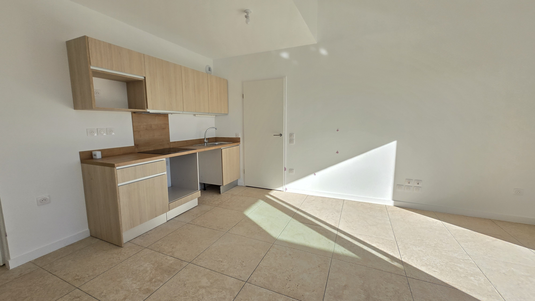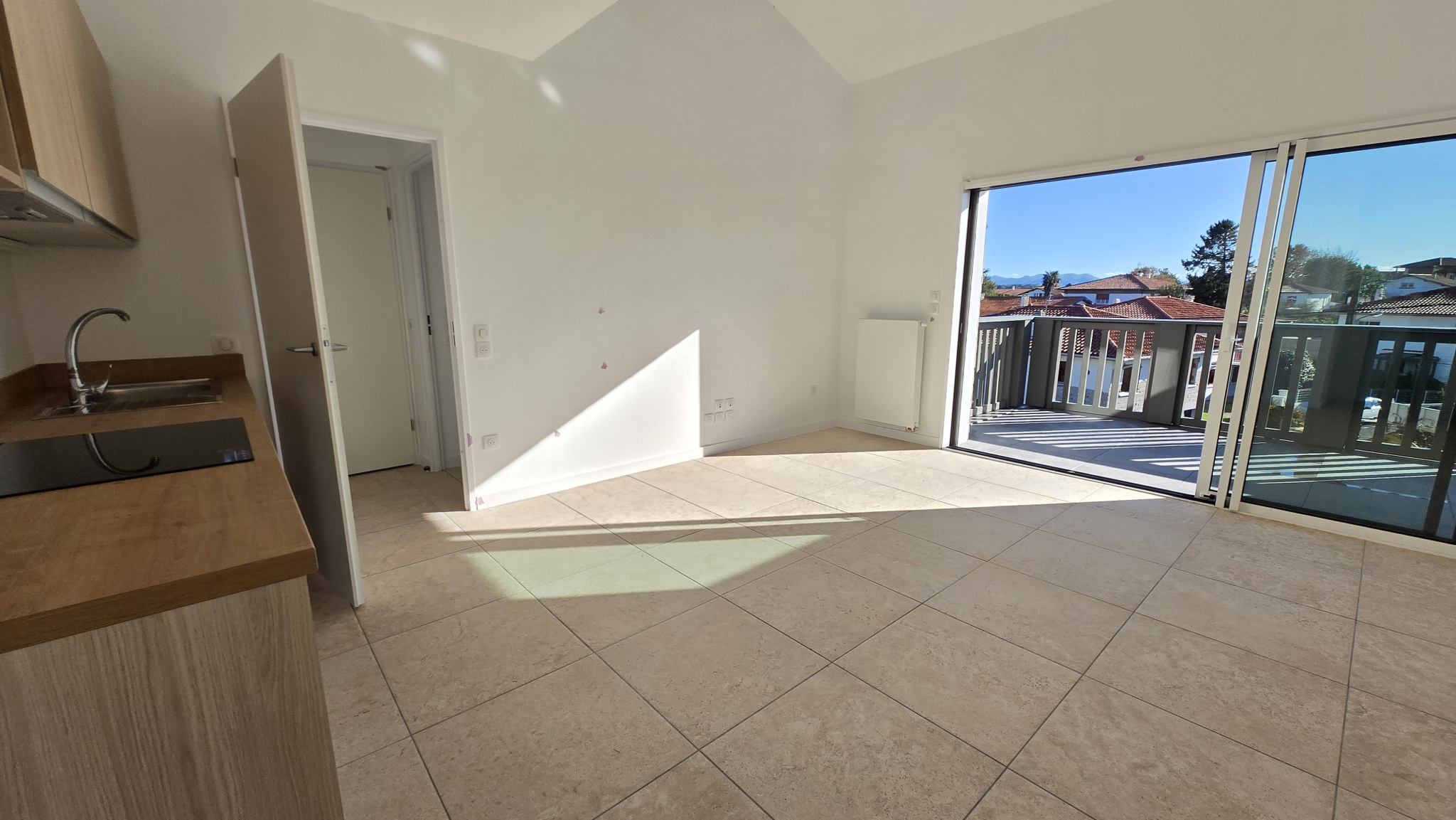 ... dégagement avec placards desservant une pièce principale avec lit armoire convertible et cuisine en...