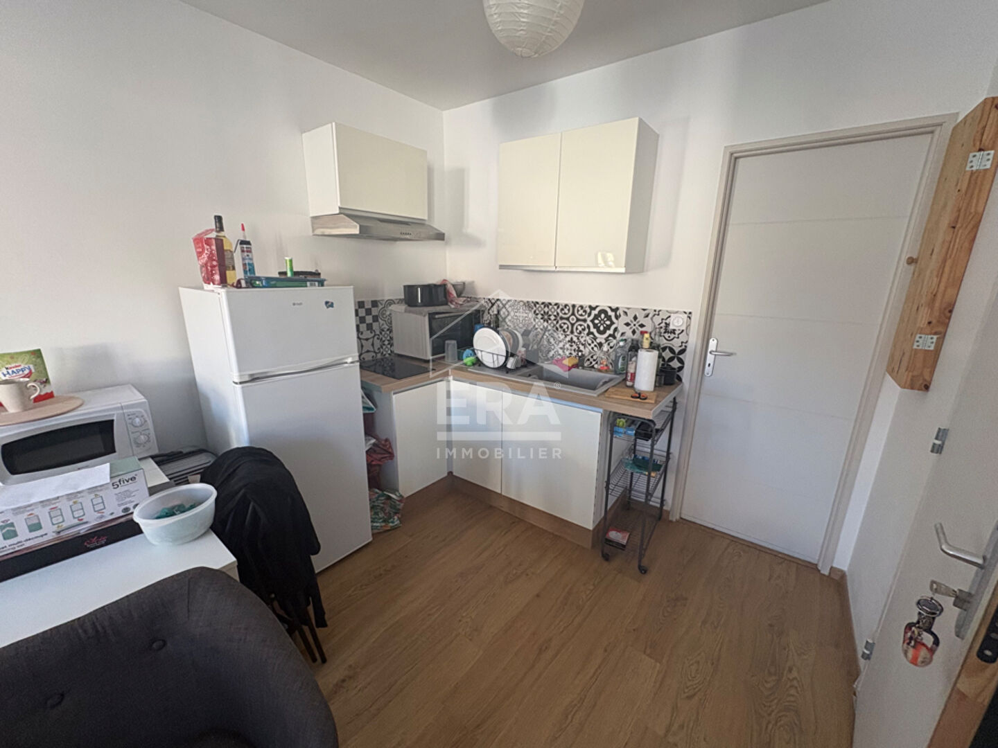 ... :une entrée avec placard, une salle d'eau rénovée, une pièce à vivre avec cuisine équipée (plaque d...