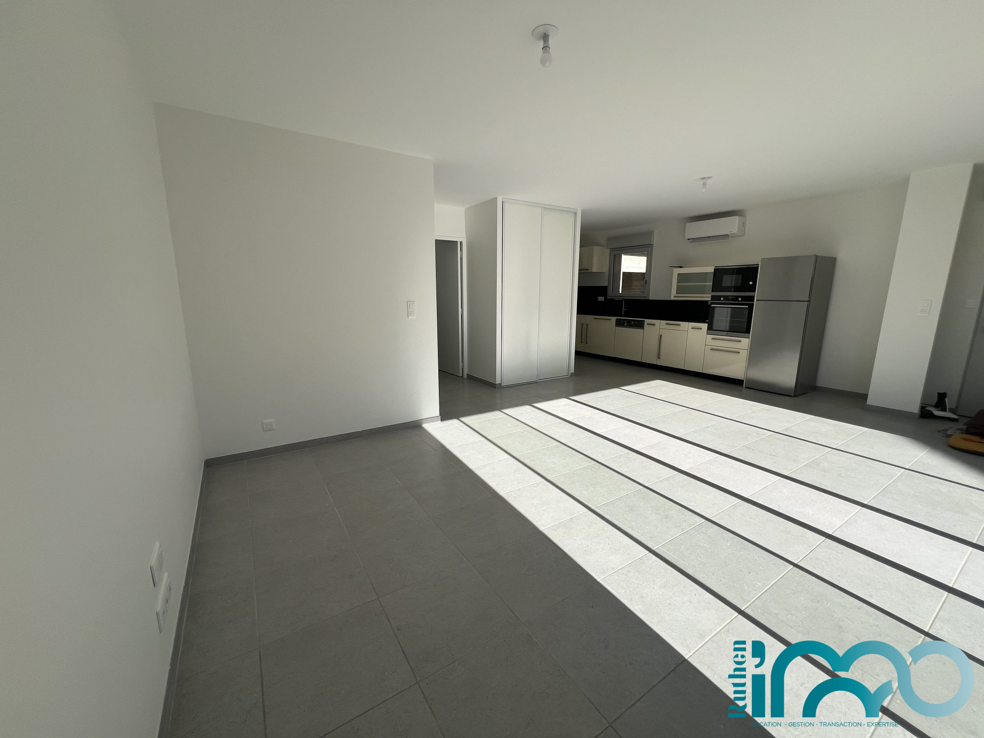 ...Entrée distribuant salon séjour avec coin cuisine intégrée et semi-équipée (plaque...