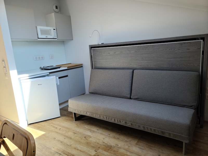 ... meublé, avec une cuisine équipée (frigo, plaque vitrocéramique, micro-ondes, hotte et rangements) e...