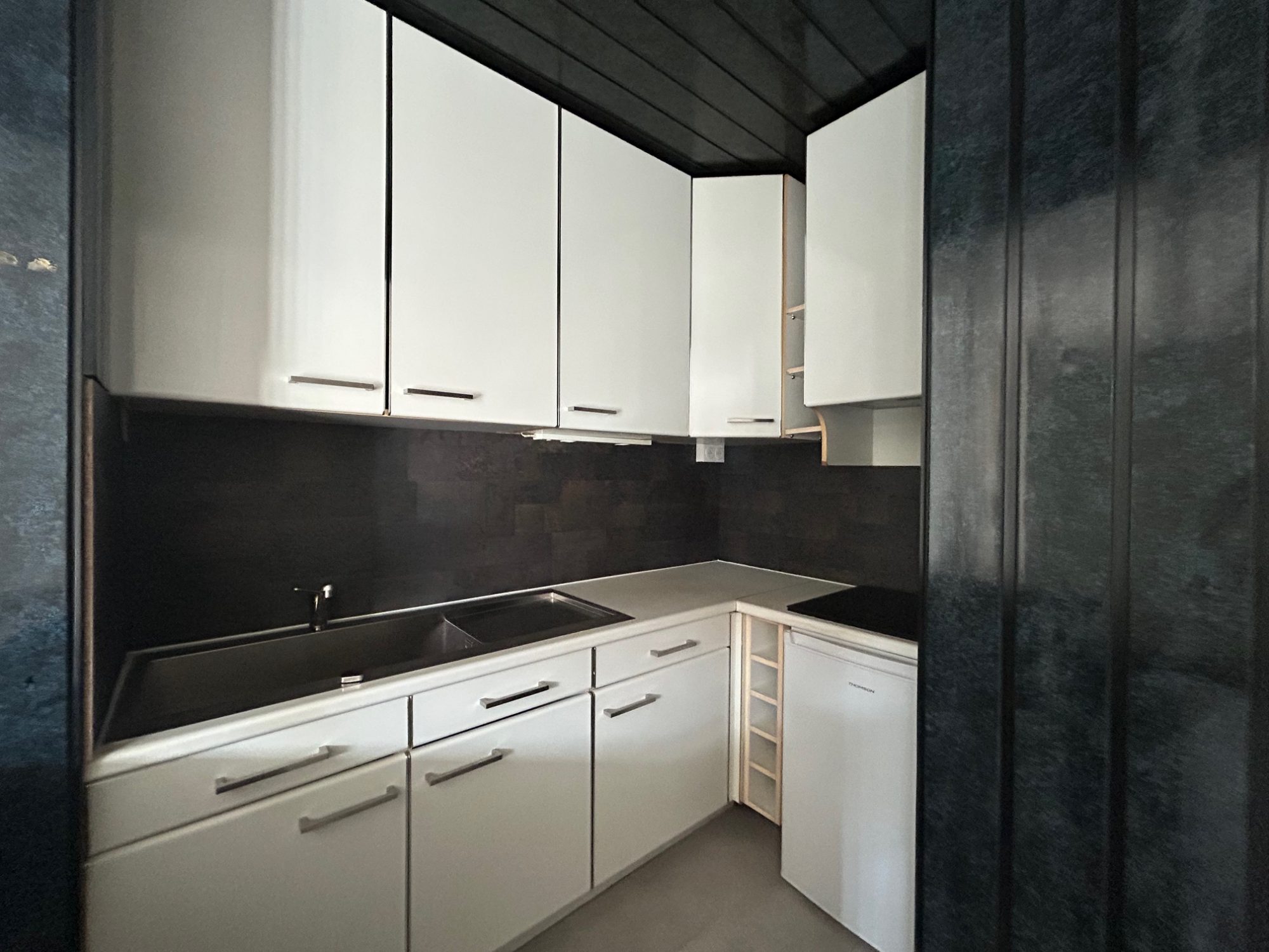 Une cuisine équipée : plaque de cuisson, hotte, évier, réfrigérateur tabletop.