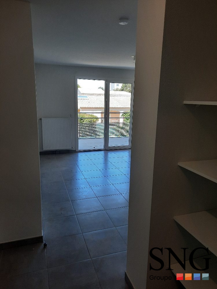 ... donnant sur une cuisine équipée d'un plan de travail, évier, plaque vitrocéramique 2 feux, hotte, r...