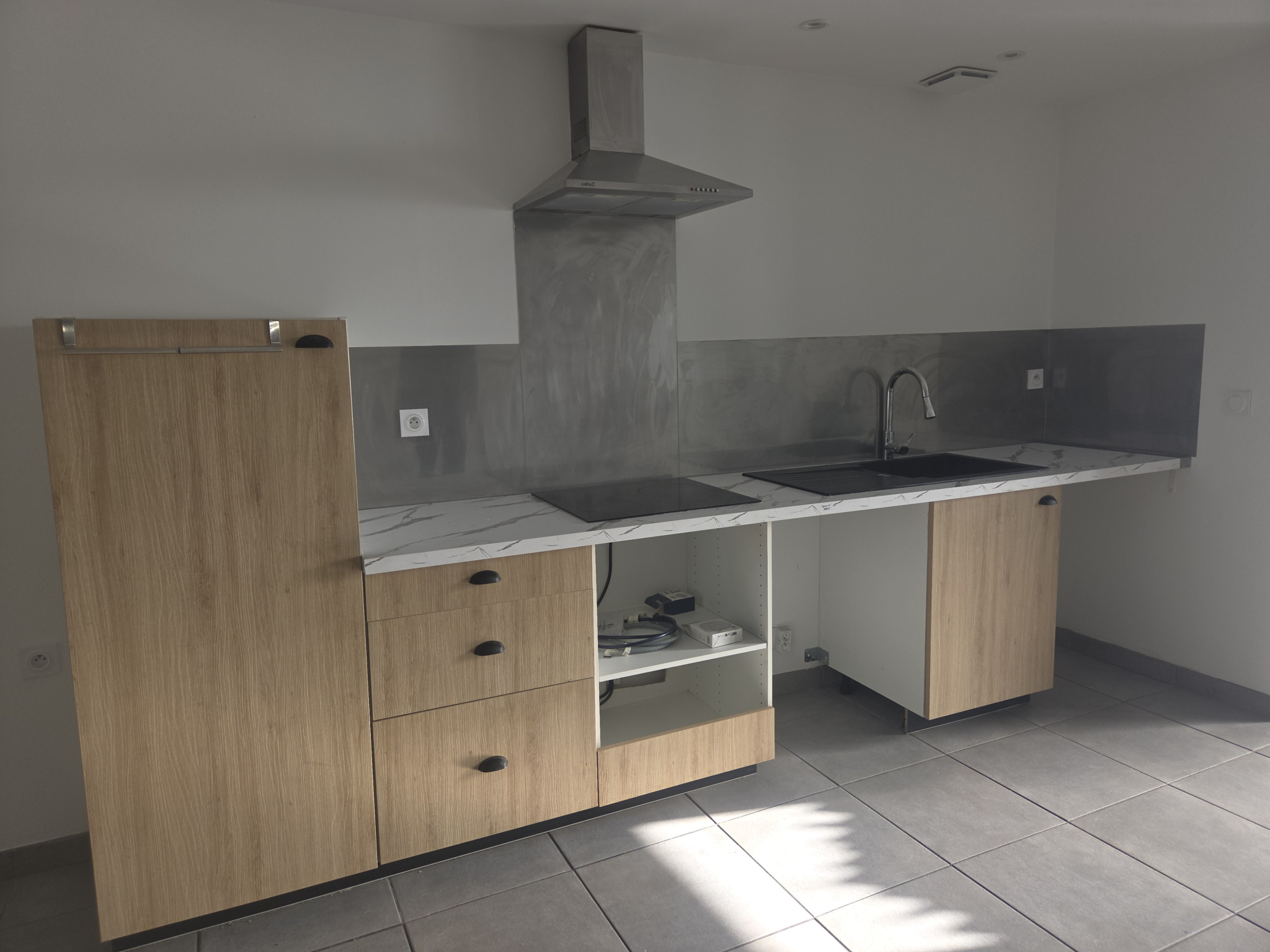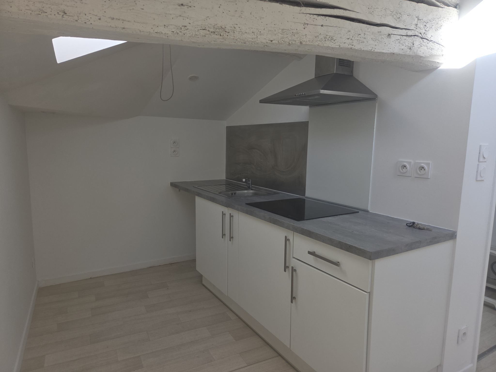 ...Il est composé d'une pièce de vie ouverte sur le coin cuisine, avec placards, hotte et plaques,...