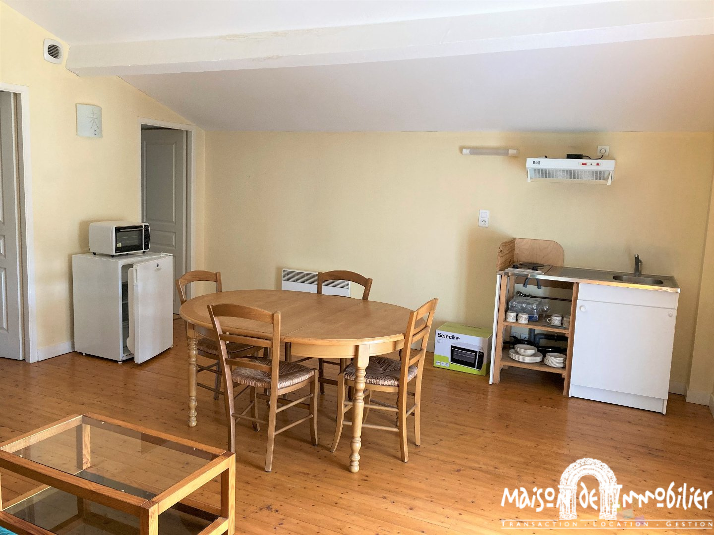 ...A l'étage : une spacieuse pièce principale, une cuisine aménagée et équipée (hotte et plaque de...