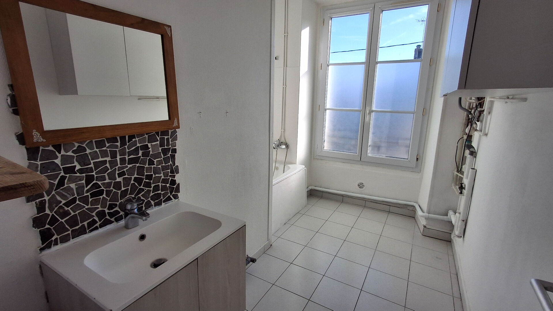 ...Il offre une entrée, un wc, une salle de bains, une cuisine , un séjour, un petit dégagement...
