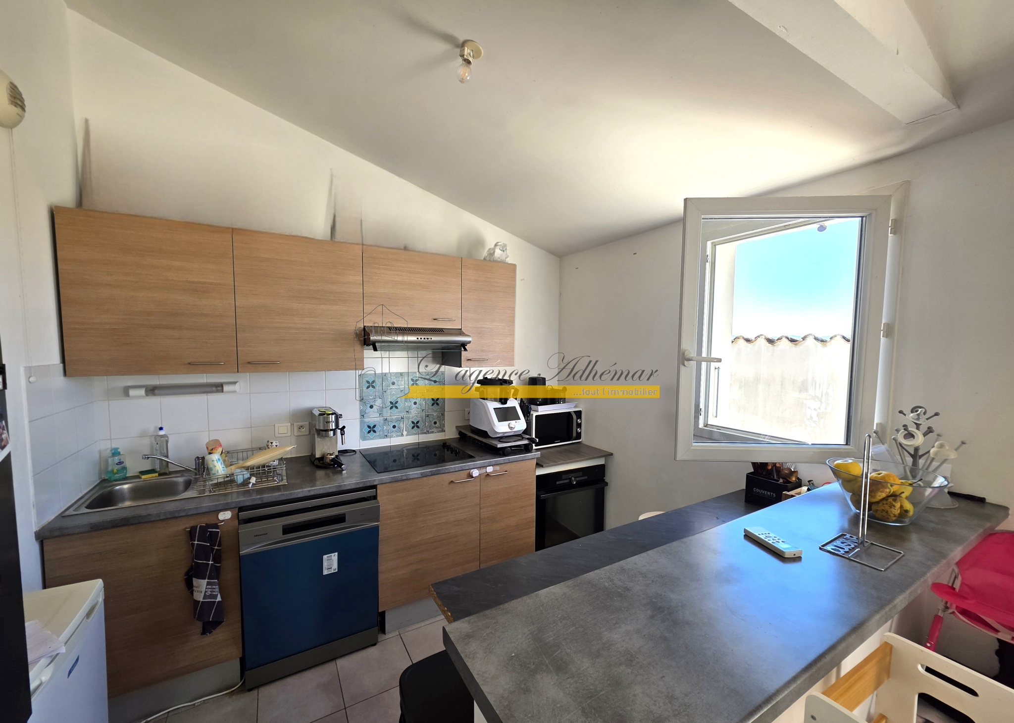 ...Cuisine équipée (four, plaque, frigo et lave vaisselle) séparée par comptoir...