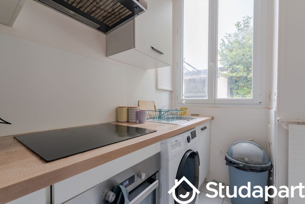 ... séjour avec coin cuisine équipée (plaque induction et hotte), un dégagement, une salle d'eau avec W...
