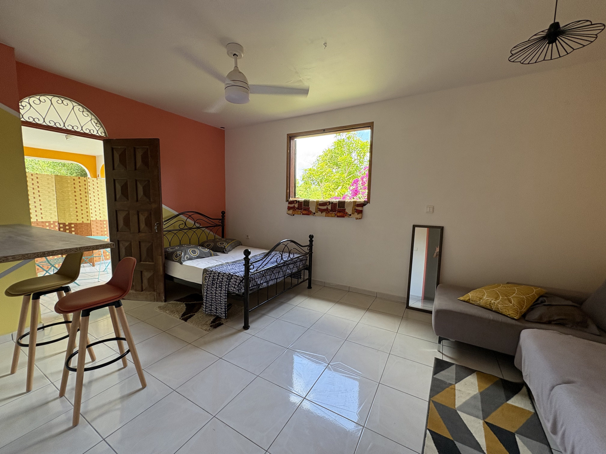 ... le joli jardin arboré non privatif, une kitchenette équipée, une pièce principale avec brasseur d'a...