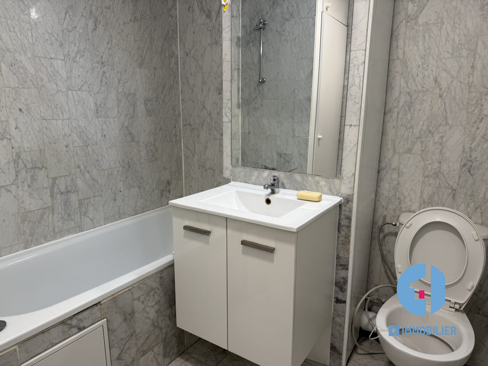 ...Studio meublé de 15 m² au 1er étage, offrant un séjour avec canapé et rangement, un coin cuisine...