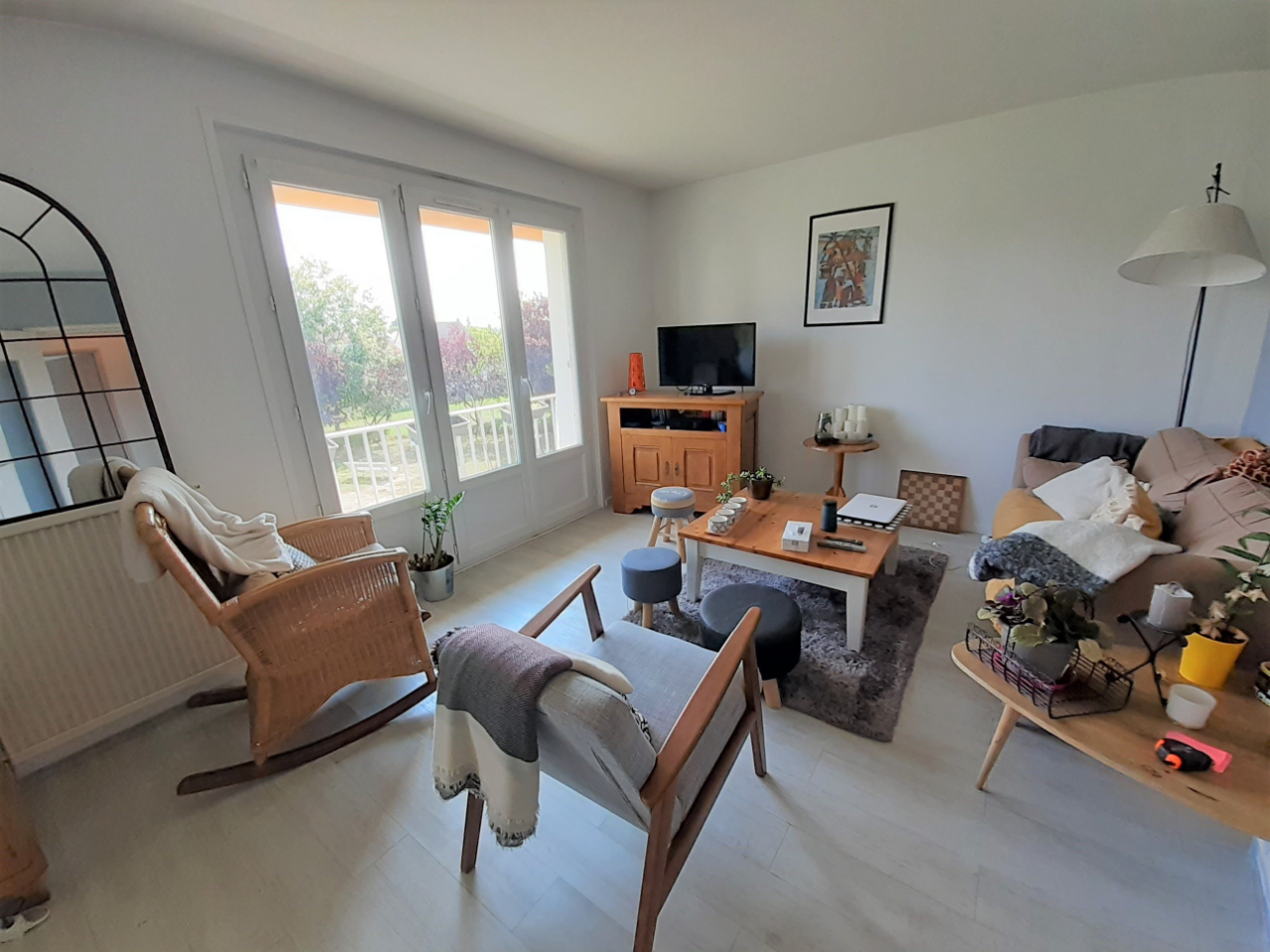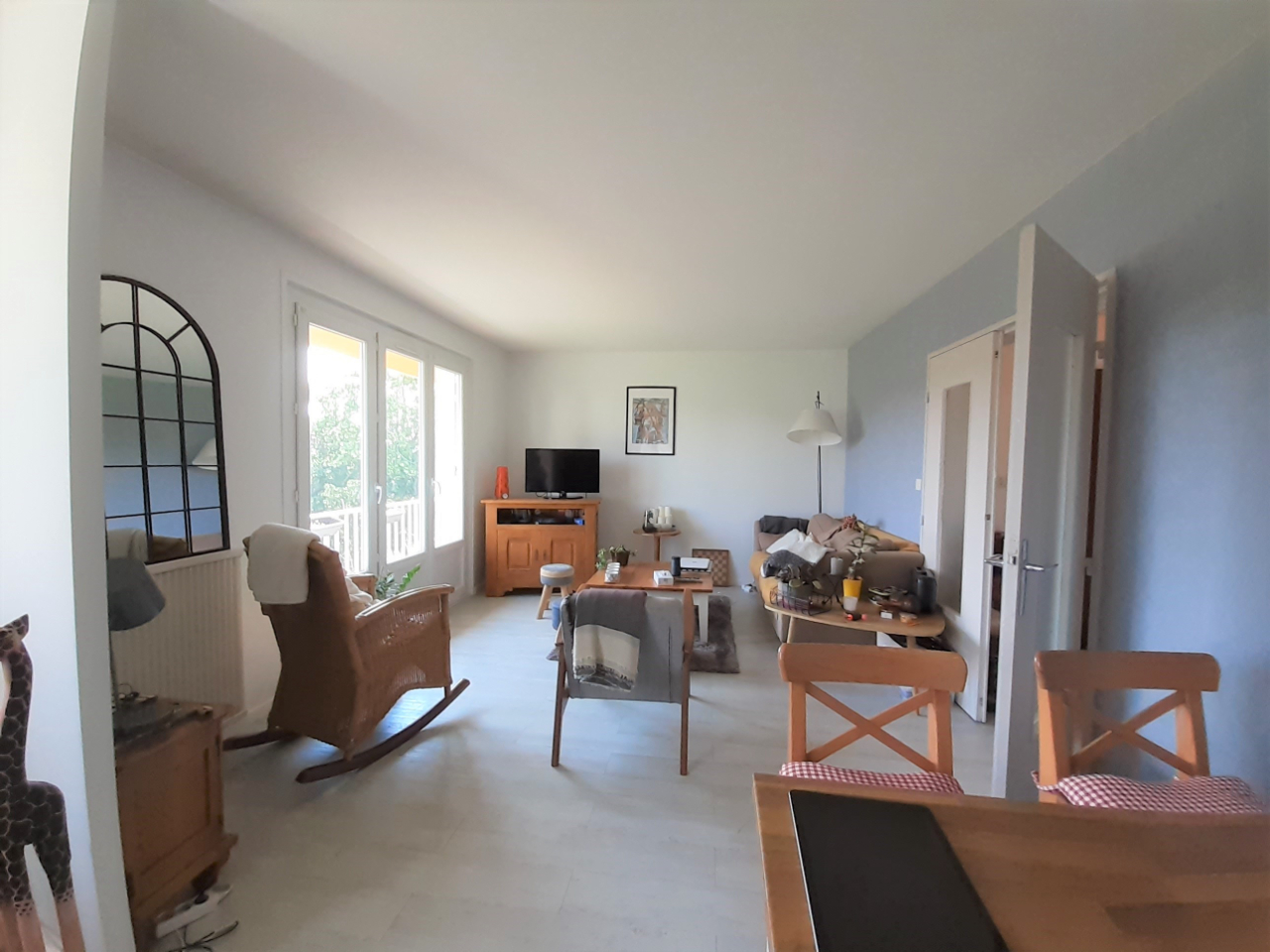 ... et un séjour lumineux ouvrant sur un balcon avec vue sur un bel espace vert, une cuisine séparée, ...