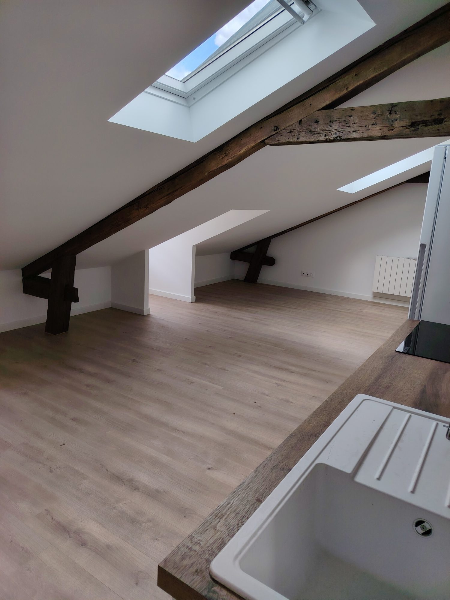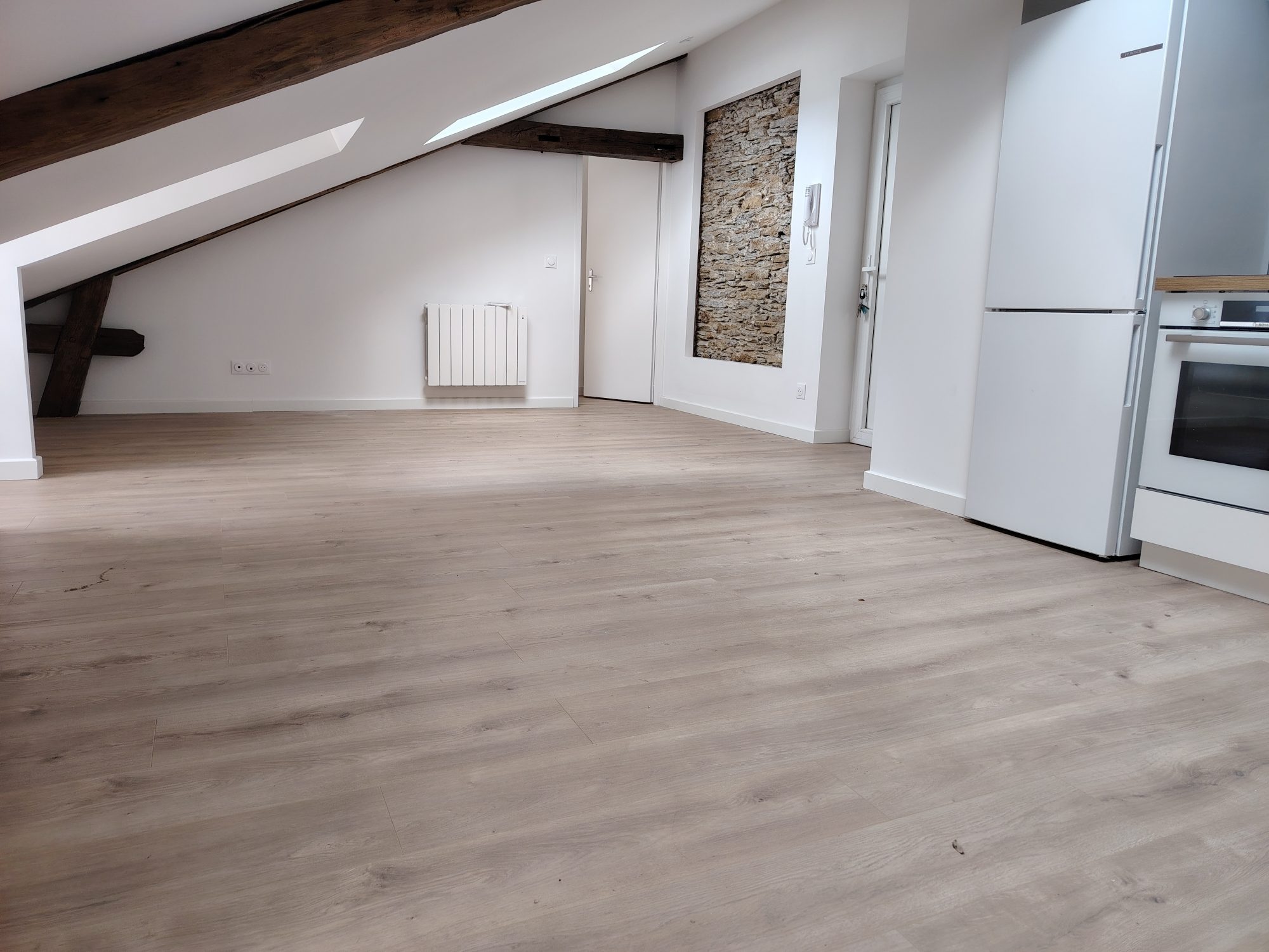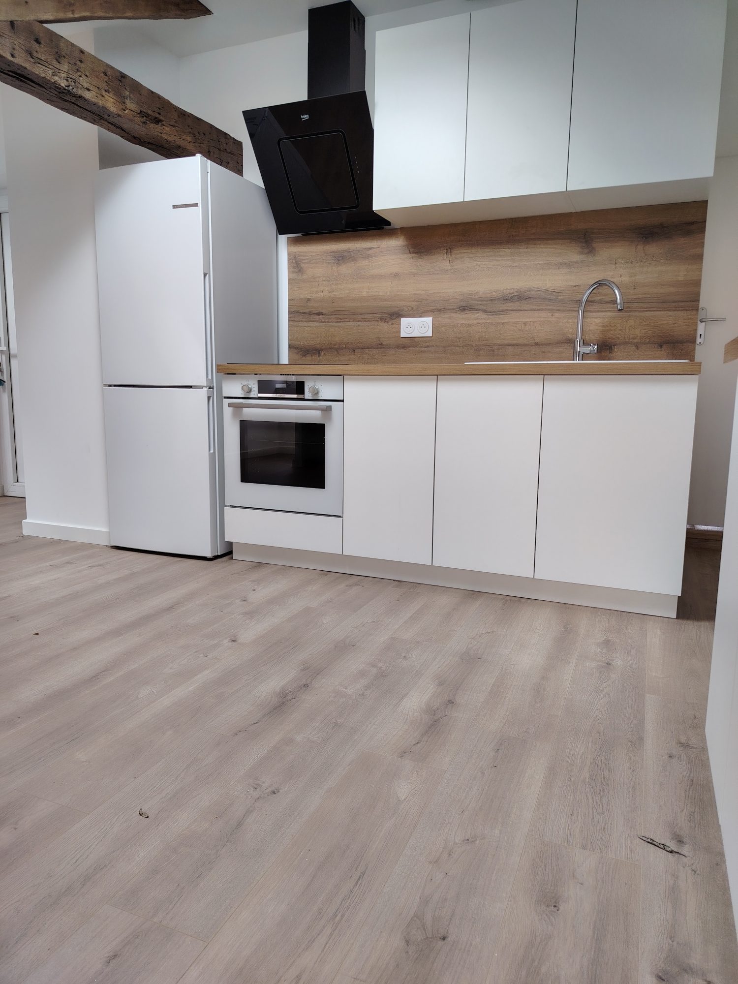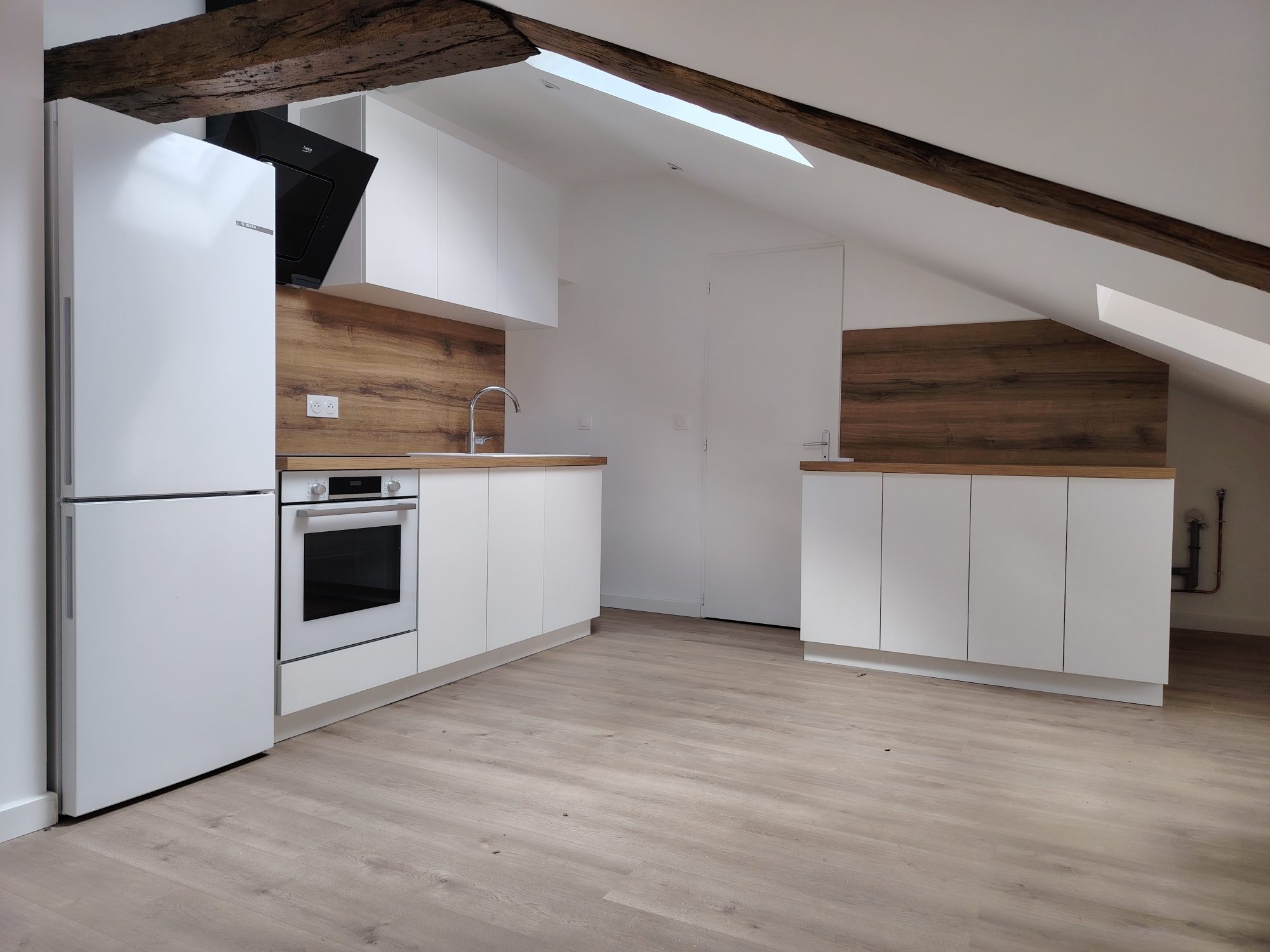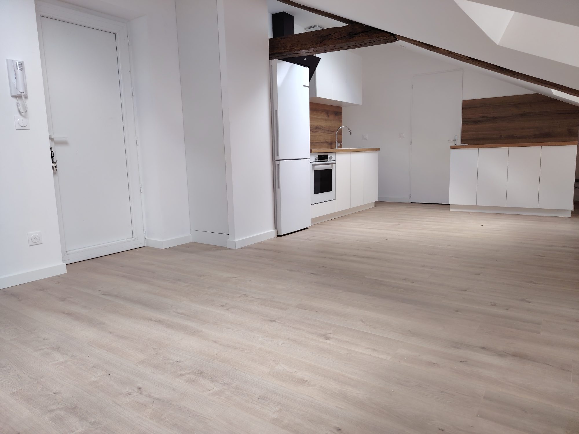 ... (frigo, plaque, placard, ilot central), une chambre, une salle de bains avec WC.
