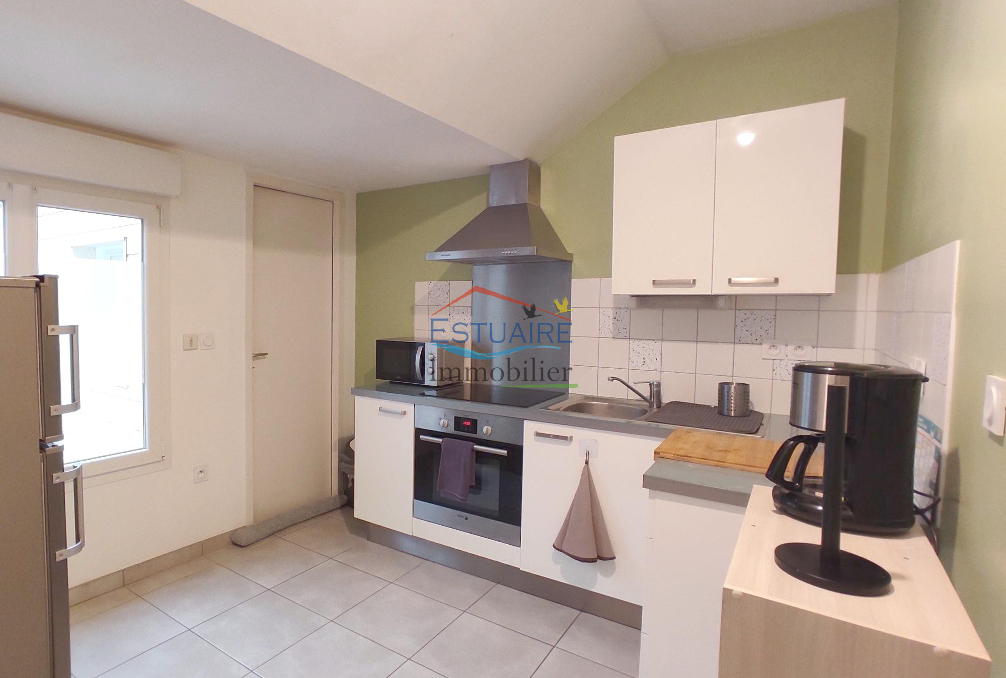 ... une entrée avec placard ouverte sur une belle pièce de vie (balcon) avec coin cuisine aménagé et éq...