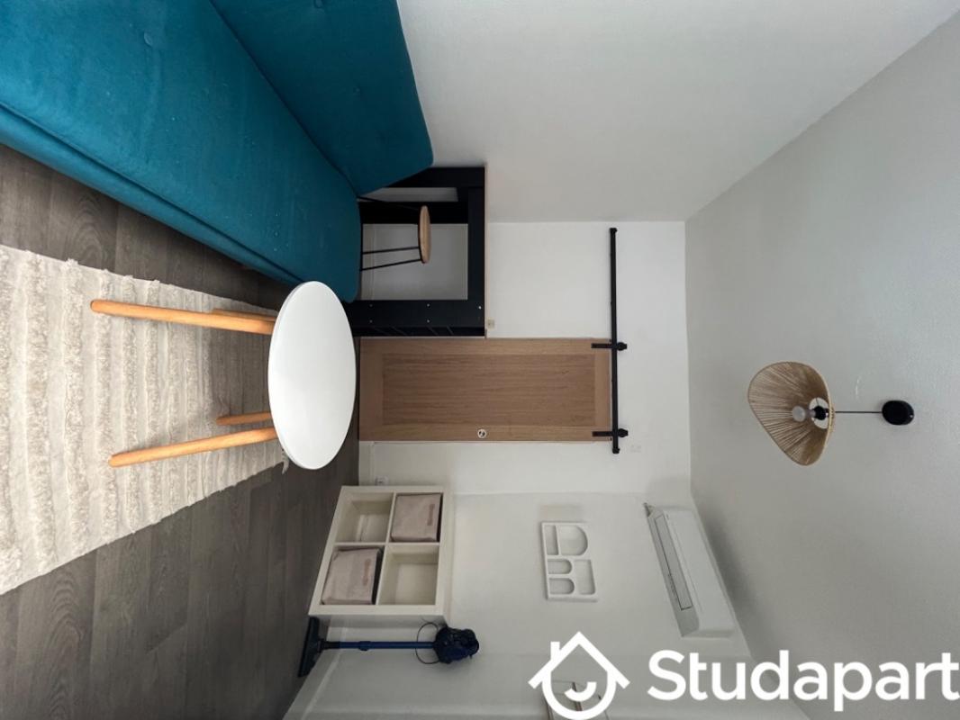 ...La pièce à vivre comporte une armoire, une table haute et un canapé convertible ainsi que de...