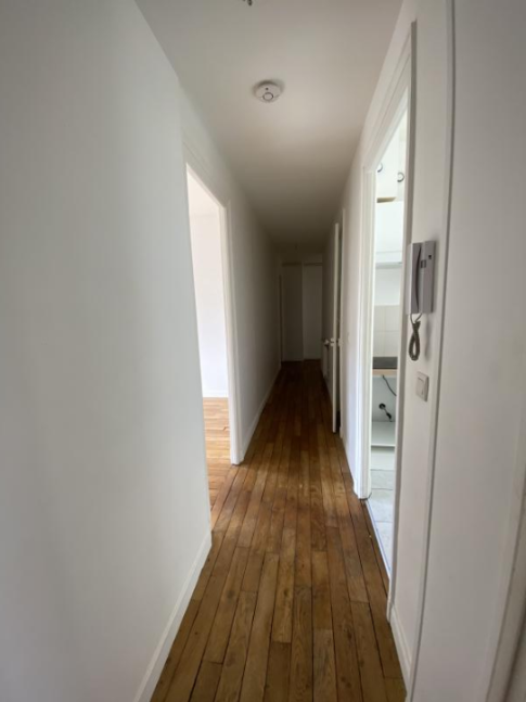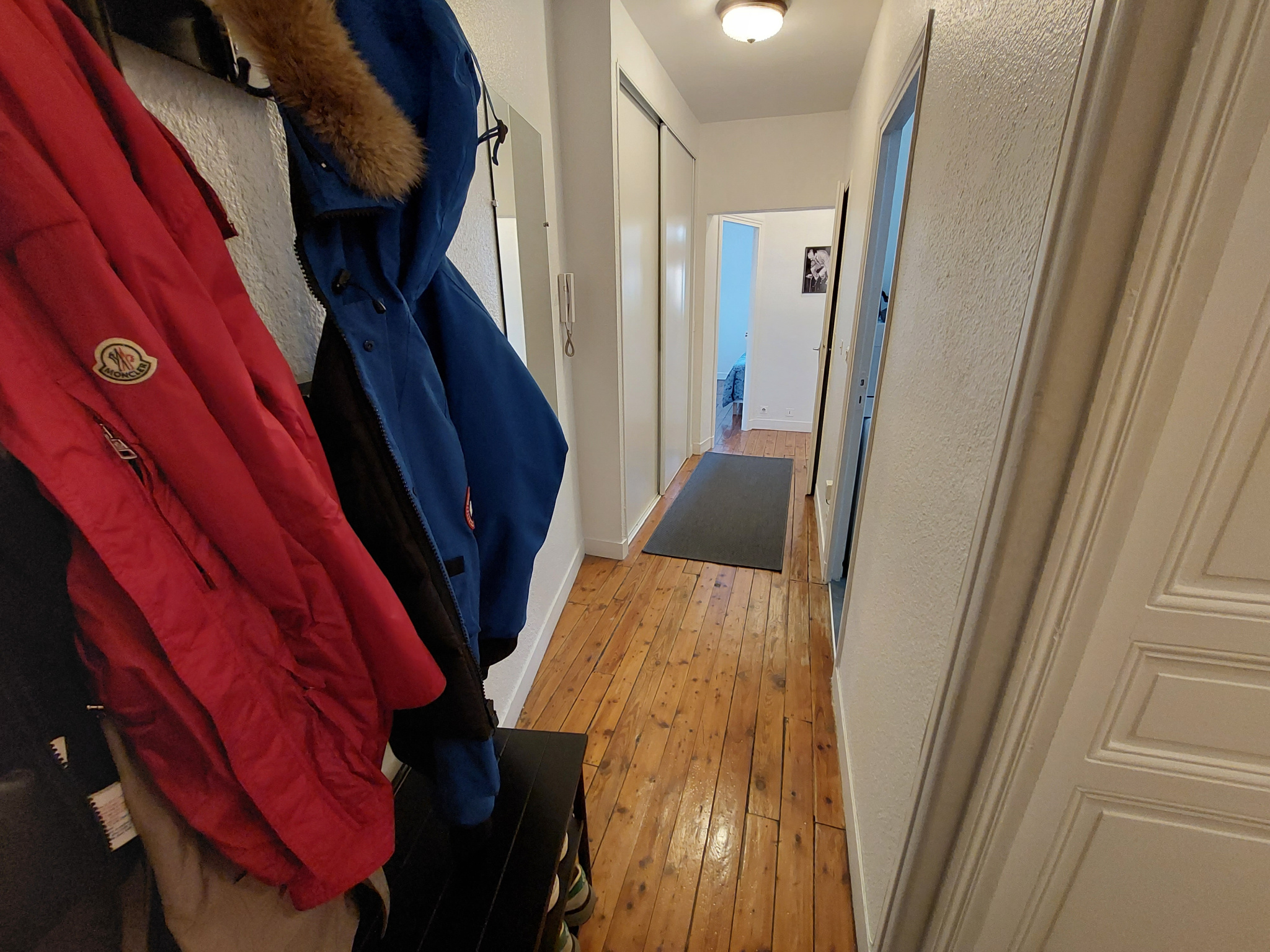 Entrée avec placard en parquet, séjour en parquet, cuisine ouverte et...