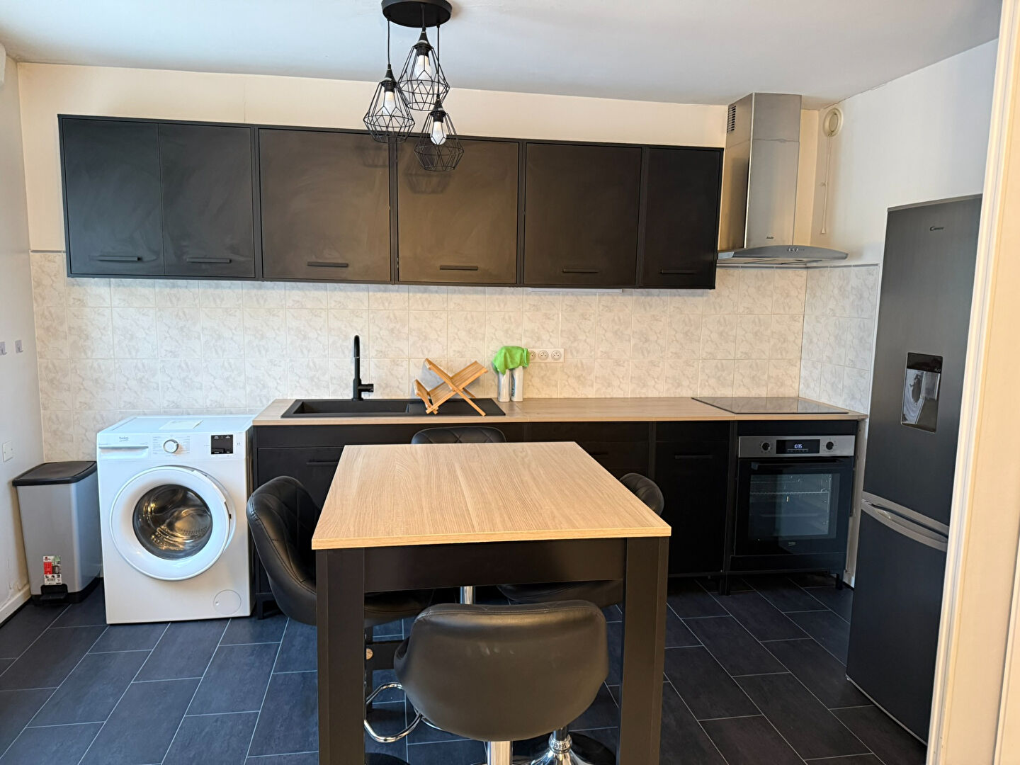 ...Entrée avec placard, pièce principal sur balcon, cuisine aménagée équipée, salle douche avec wc...