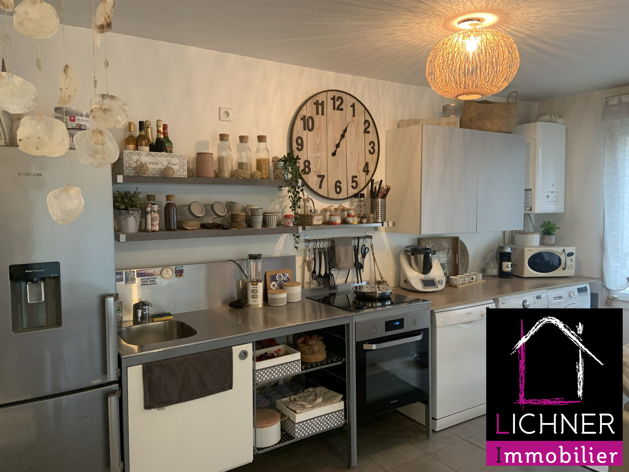 ... entrée avec placard, d'une cuisine équipée (meubles , plaque de cuisson, hotte, réfrigérateur, micr...