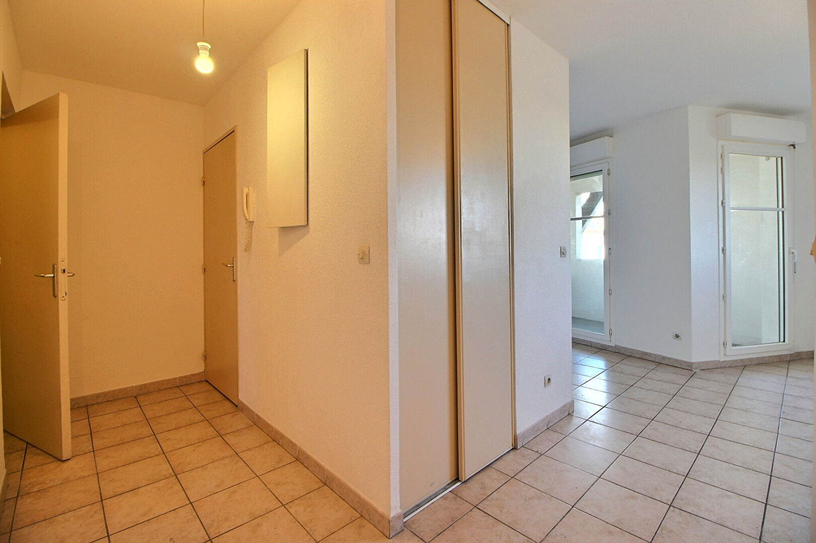 ... une entrée avec placard, séjour donnant sur balcon, coin cuisine équipée, salle d'eau et wc C...