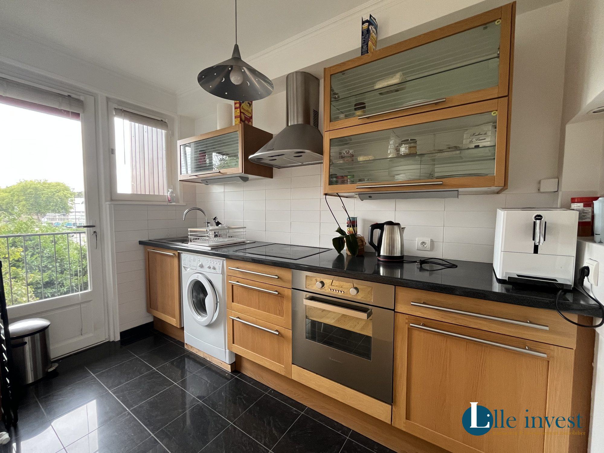 ... une entrée avec placard, un séjour lumineux avec un coin bureau, une cuisine ouverte aménagée et éq...