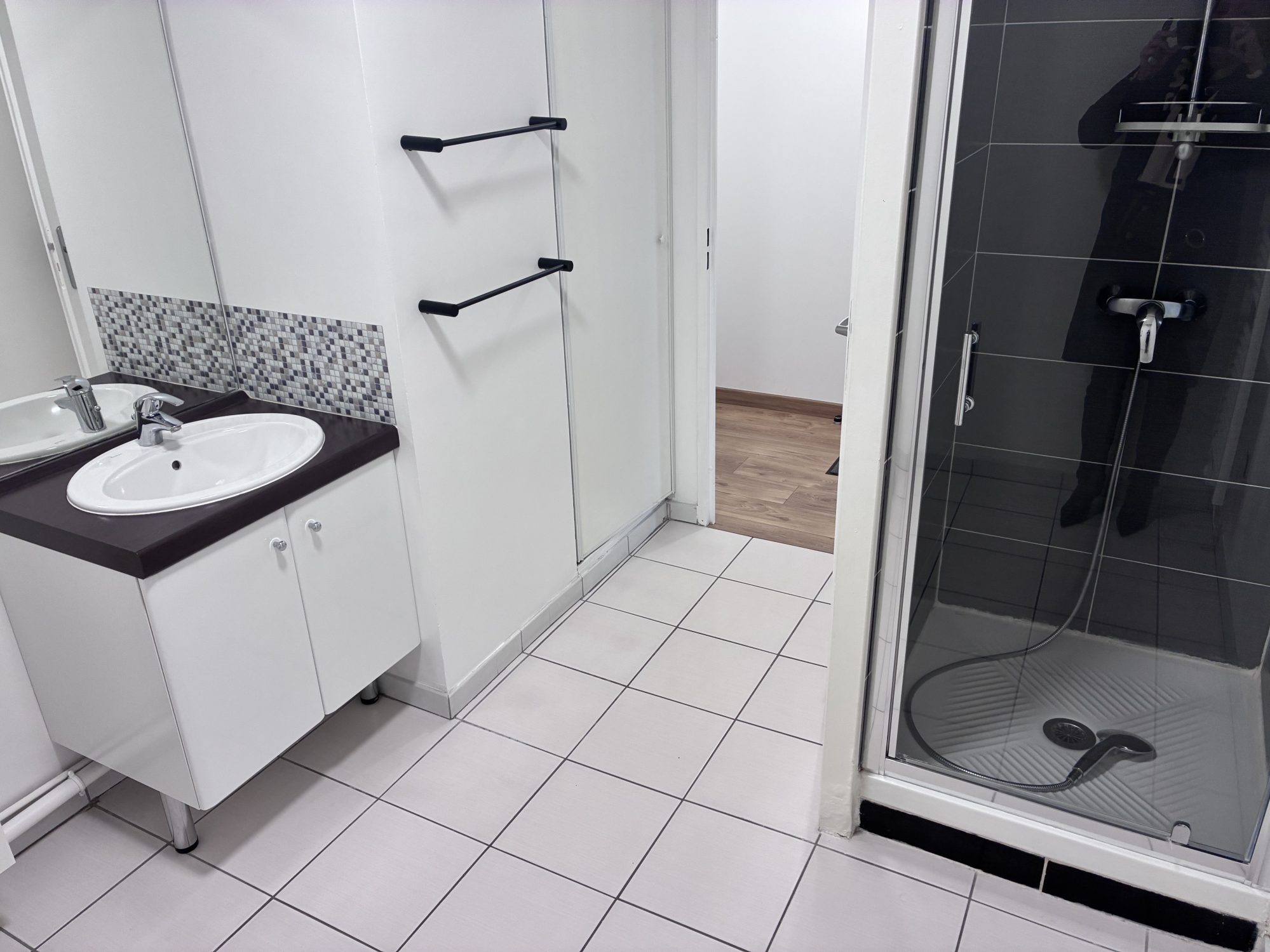 ... (lave-main, placards). Une salle de bain avec branchements machine à laver et sèche linge.