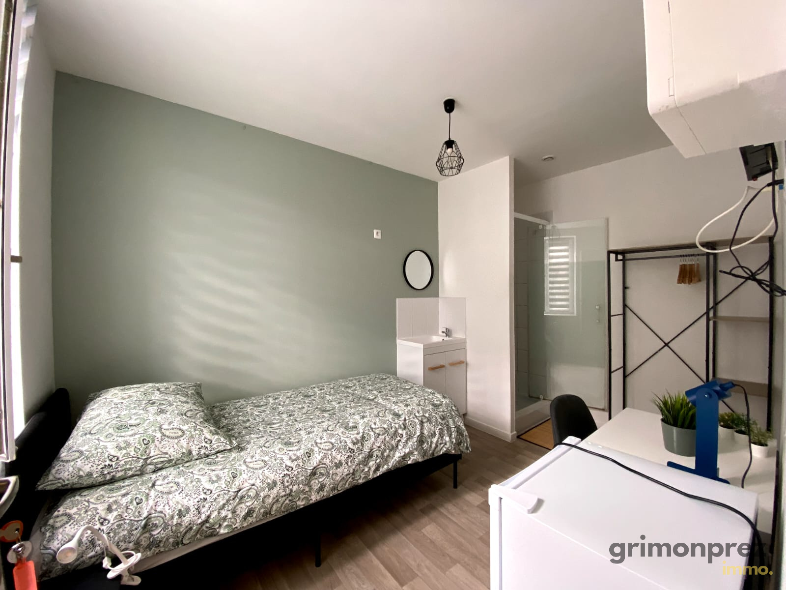 ...-une chambre de 14 m² composée d'un espace nuit, un espace travail et d'une salle de douche avec ...