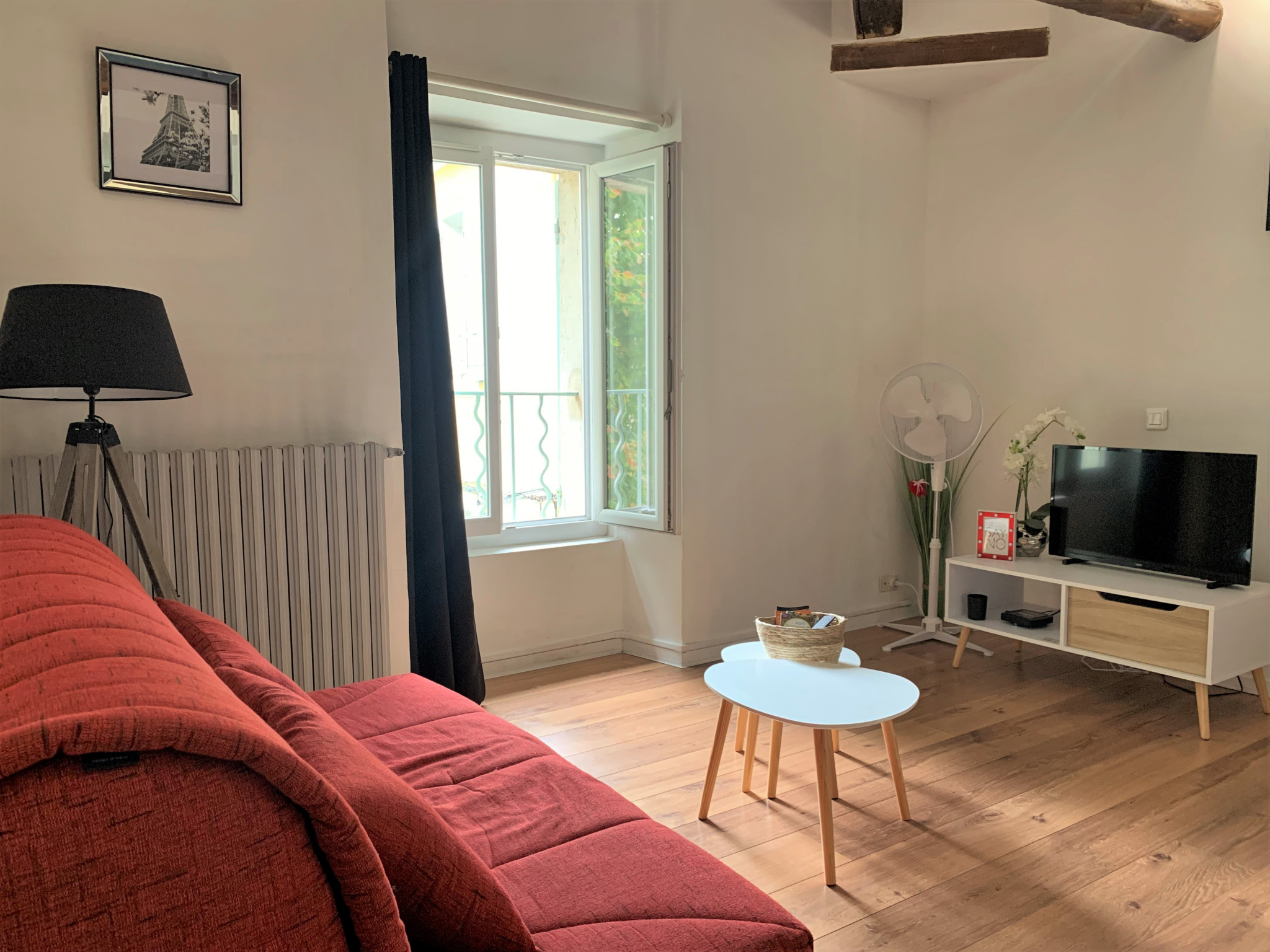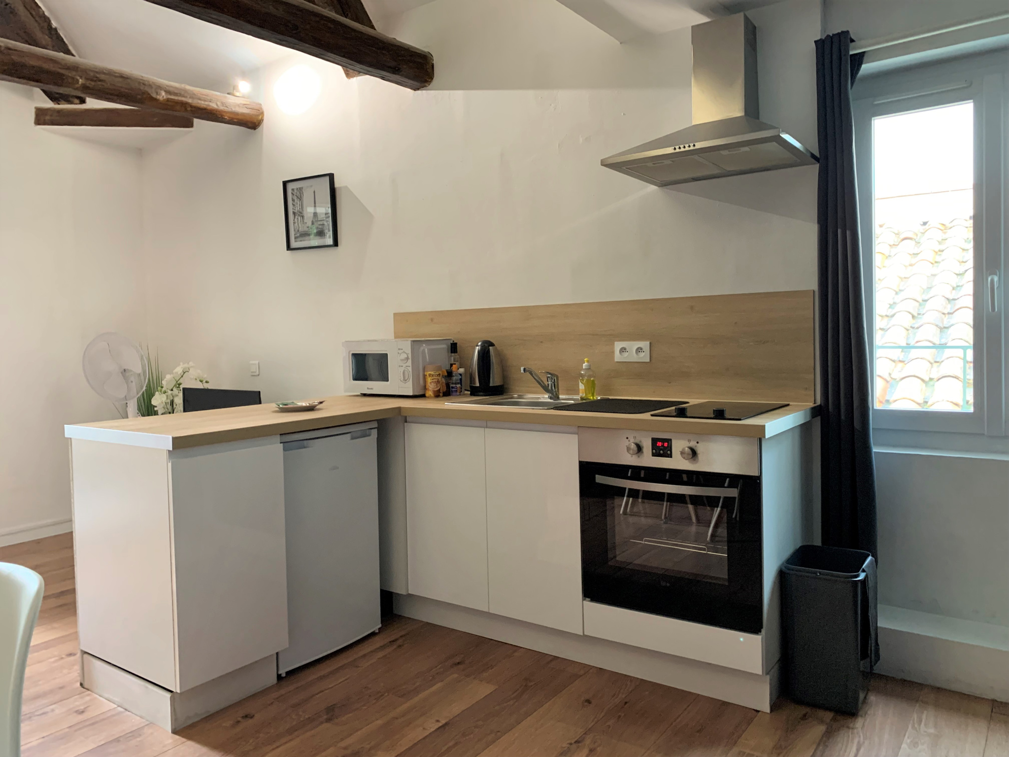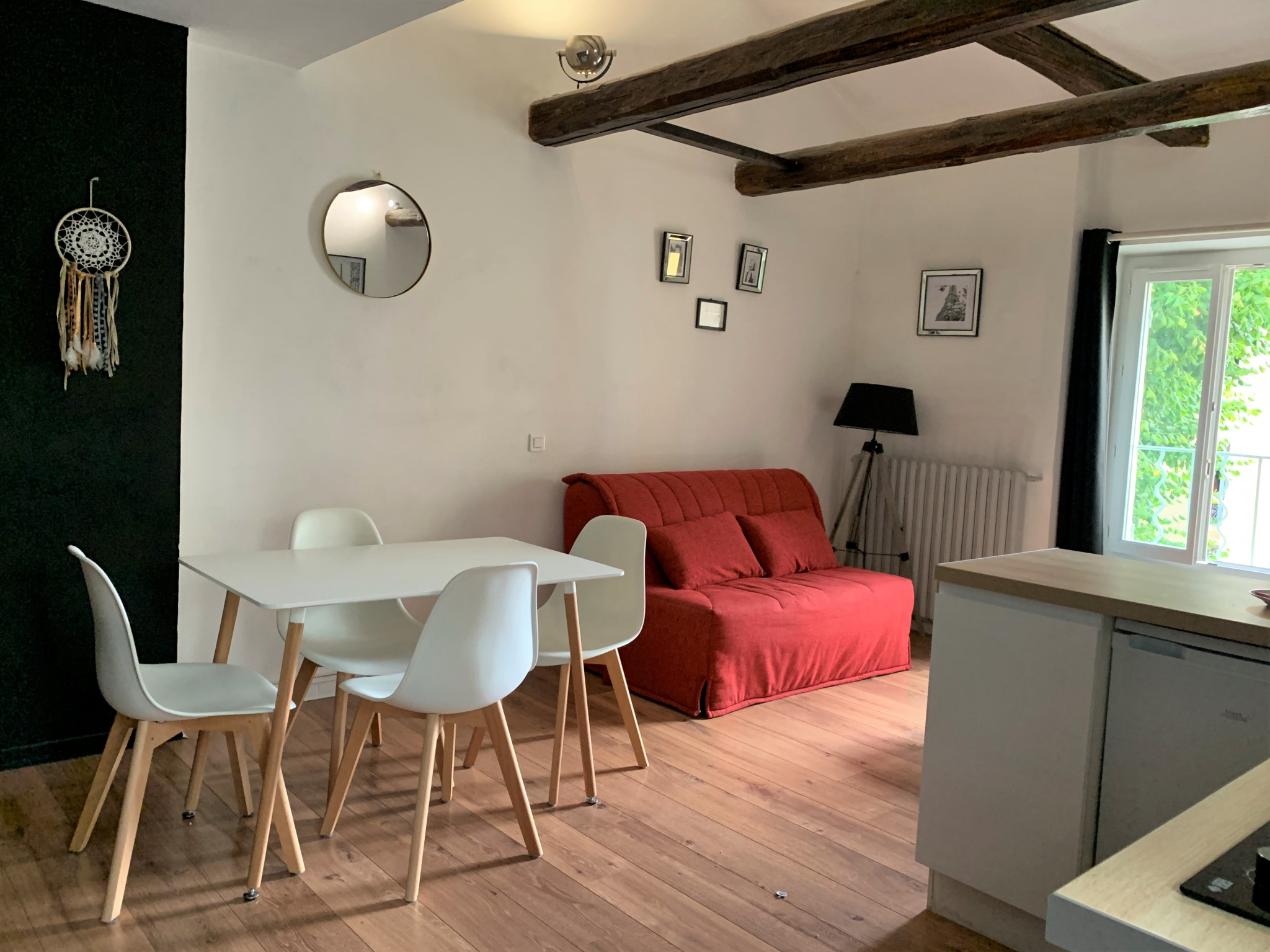 ... d'un séjour lumineux avec cuisine équipée ouverte, une chambre avec placard intégré et une salle de...
