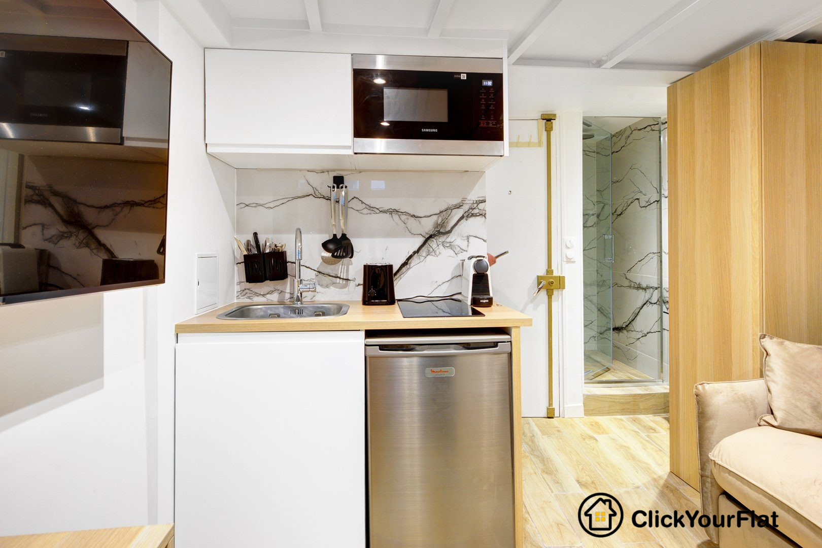 ... Une cuisine moderne et entièrement équipée complète l'espace de vie.