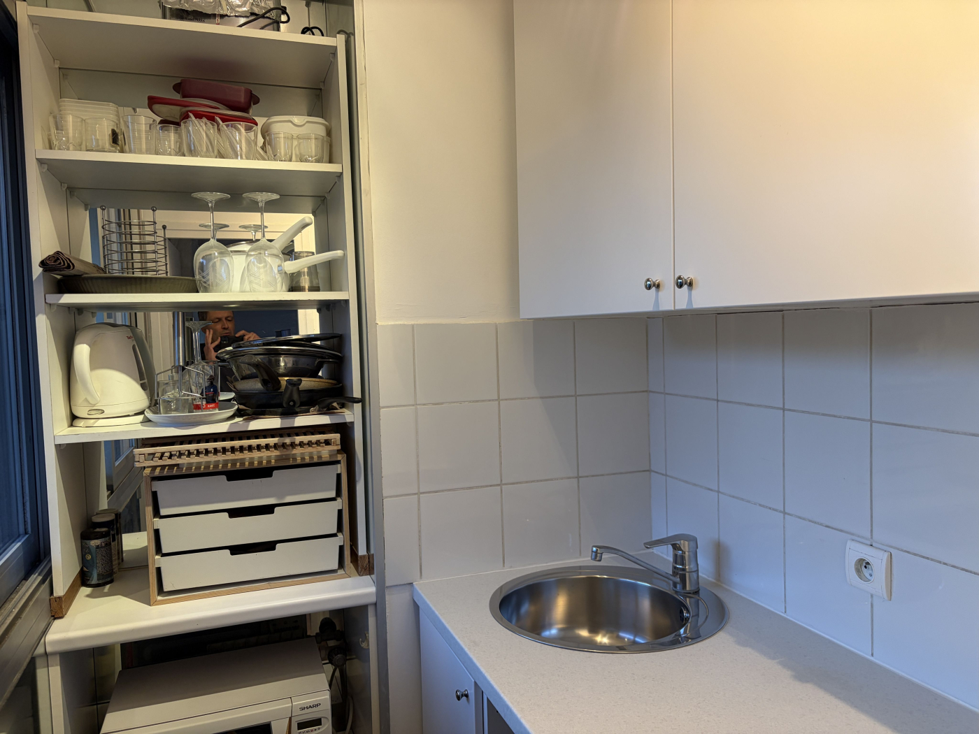 ...Il comprend : Coin cuisine équipé (plaques, micro-ondes, réfrigérateur) Grand Placard de...