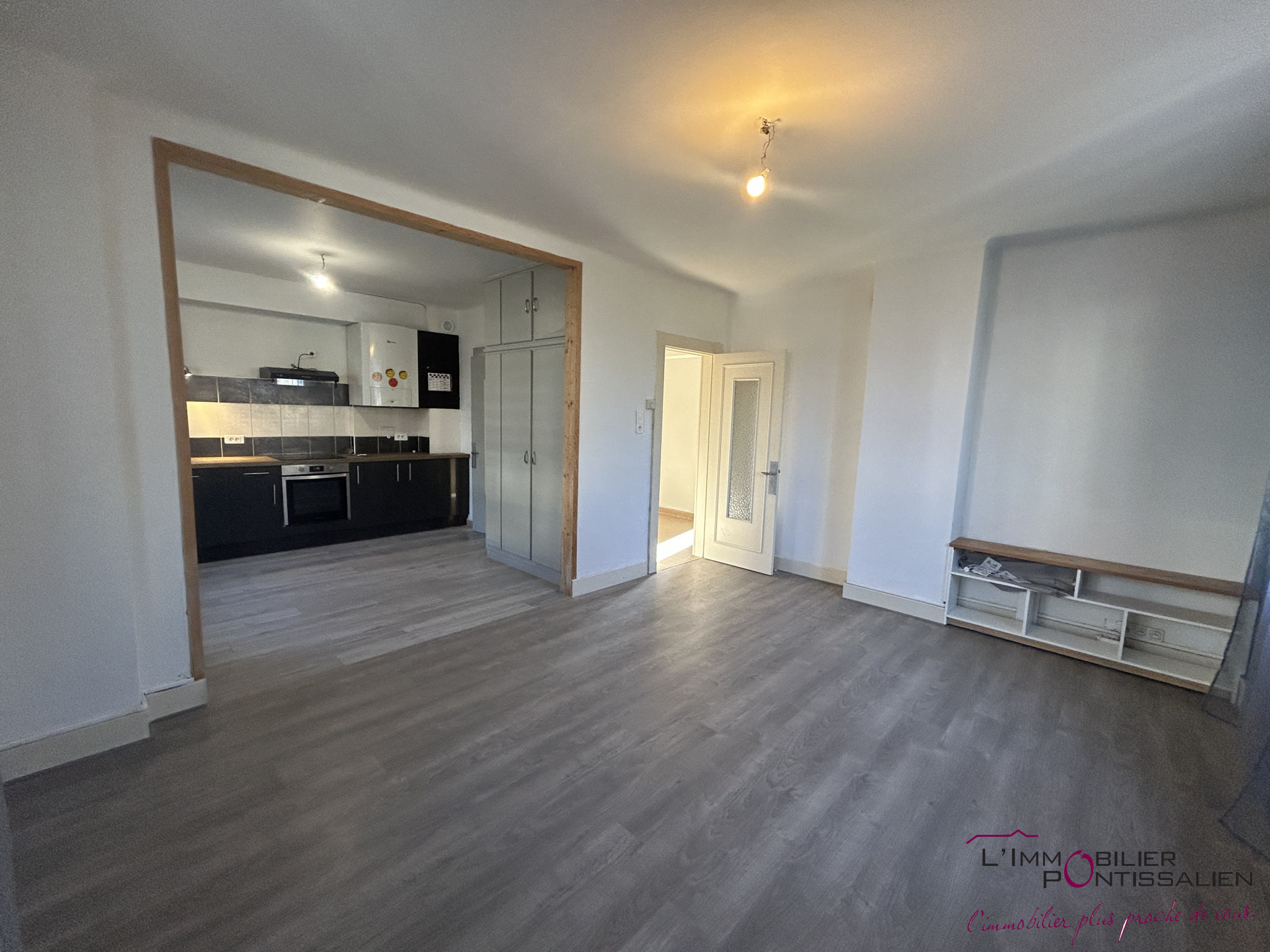... une entrée avec placard de rangement, une chambre, une cuisine équipée et aménagée ouverte sur séjo...