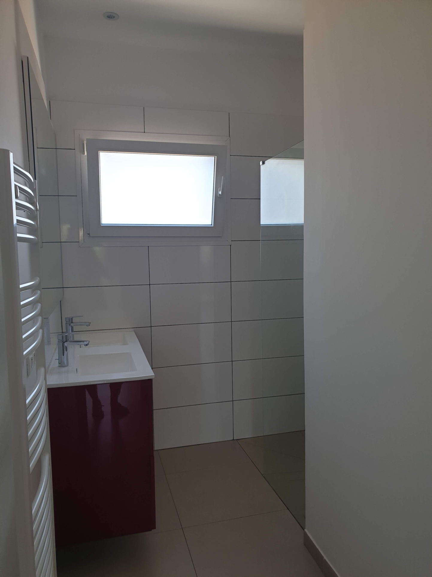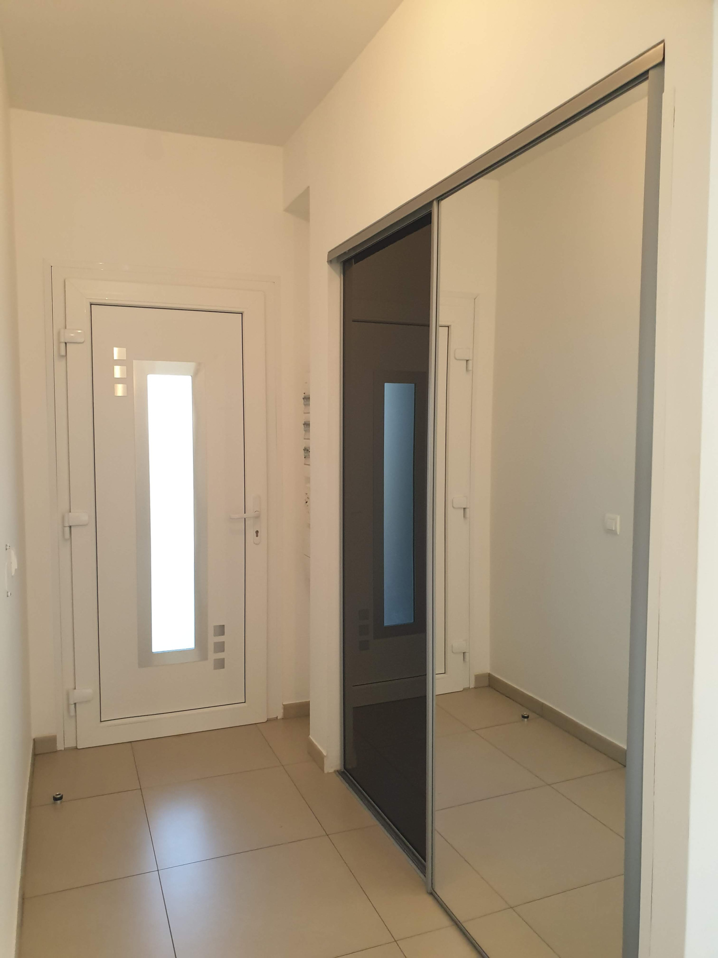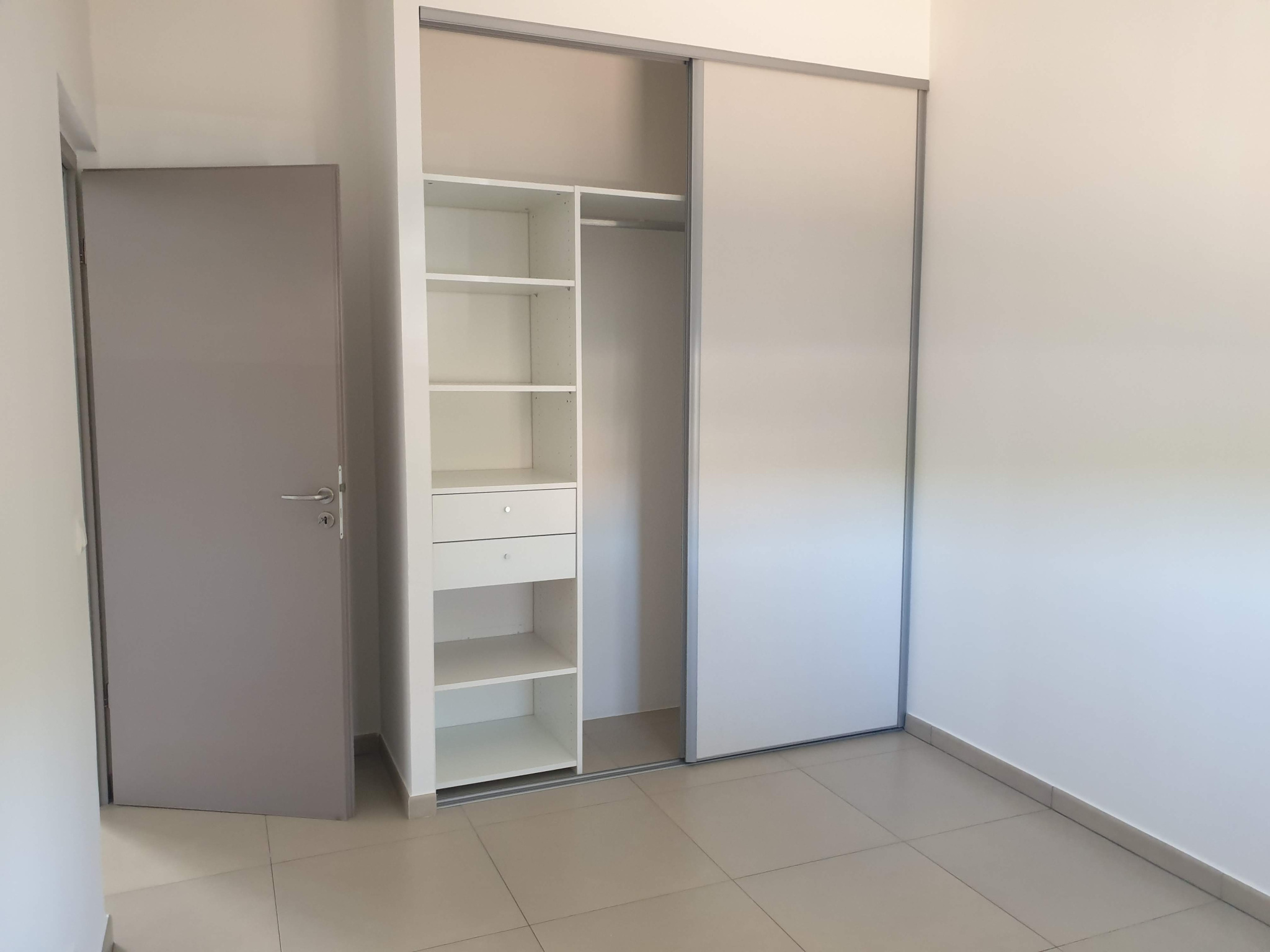 ... un couloir avec placard encastré, une cuisine aménagée en meuble avec hotte et évier, un séjour, de...