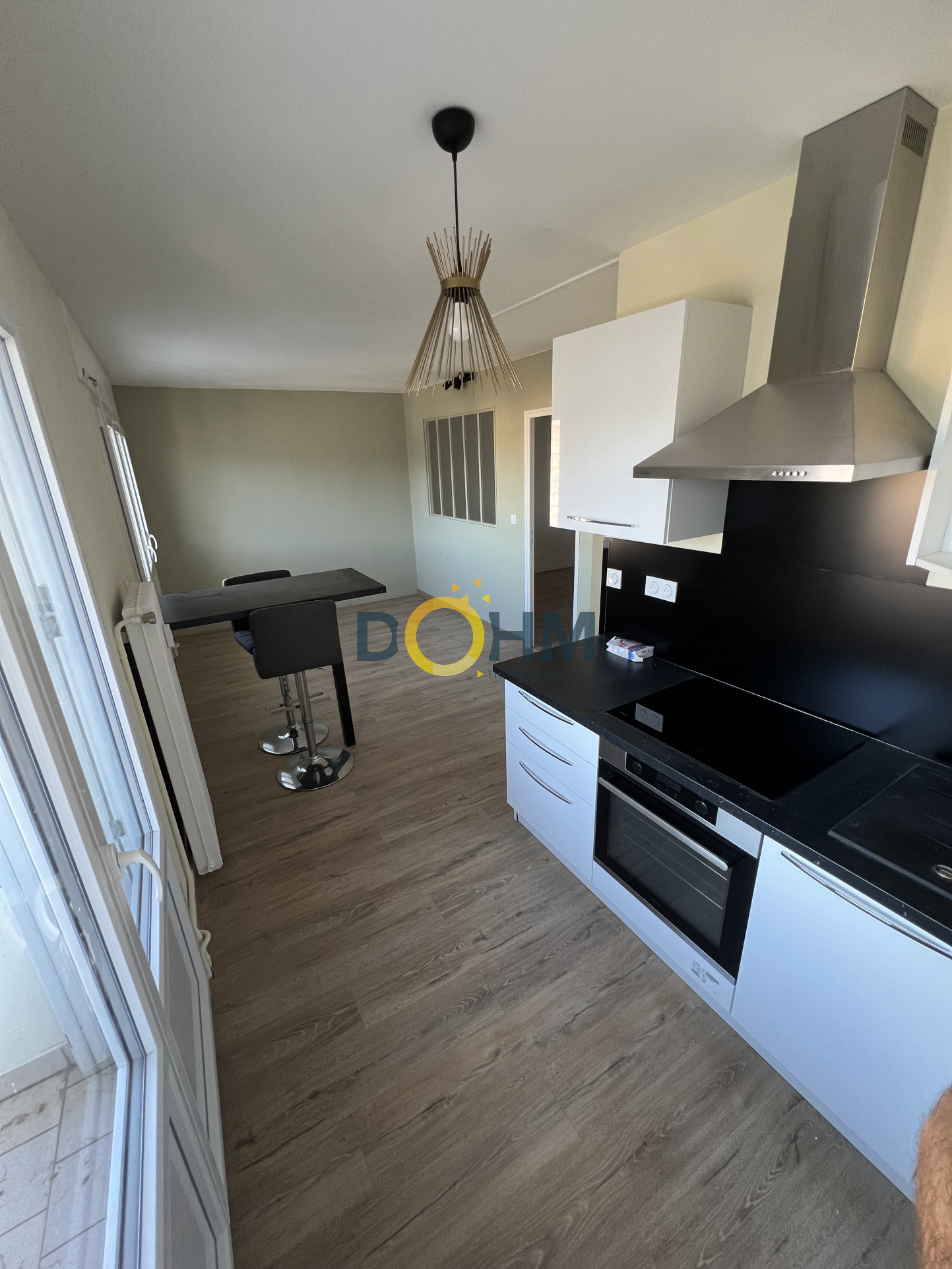 ...Entrée directe sur pièce de vie lumineuse avec canapé clic-clac, coin cuisine avec plaques, frigo...