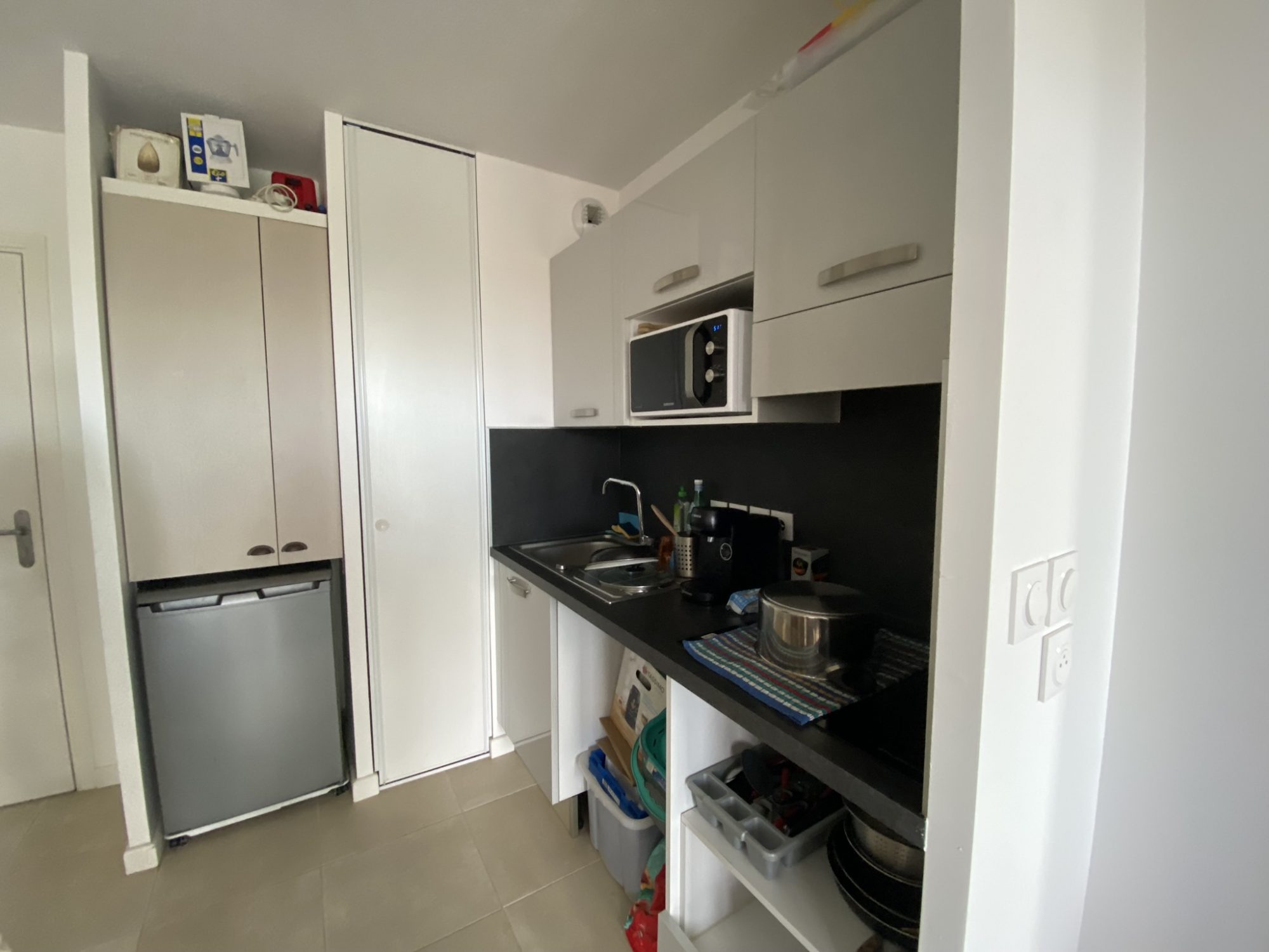 ...Un séjour avec cuisine américaine aménagée et équipée (plaques vitrocéramique 4 feux et hotte...