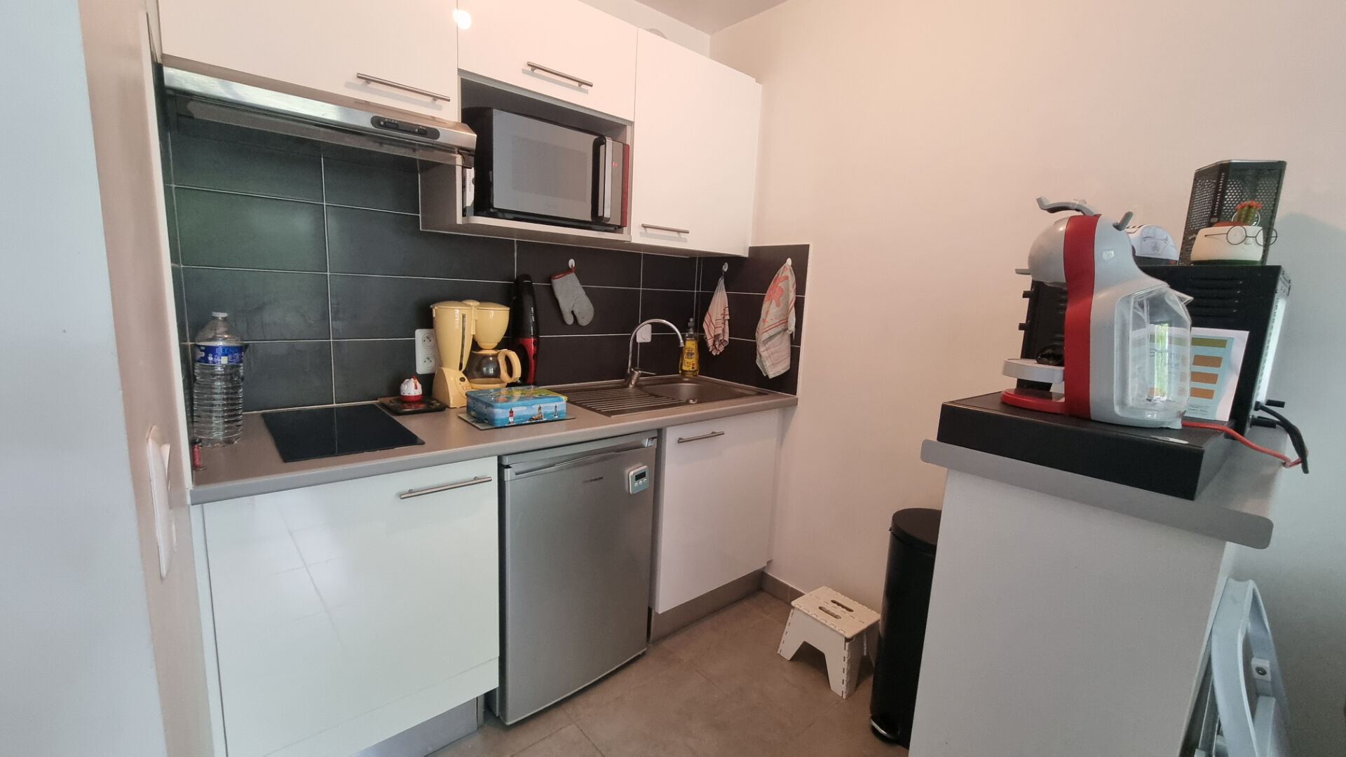 ... une entrée avec placard, un salon-séjour avec coin cuisine aménagée (plaque de cuisson, réfrigérate...