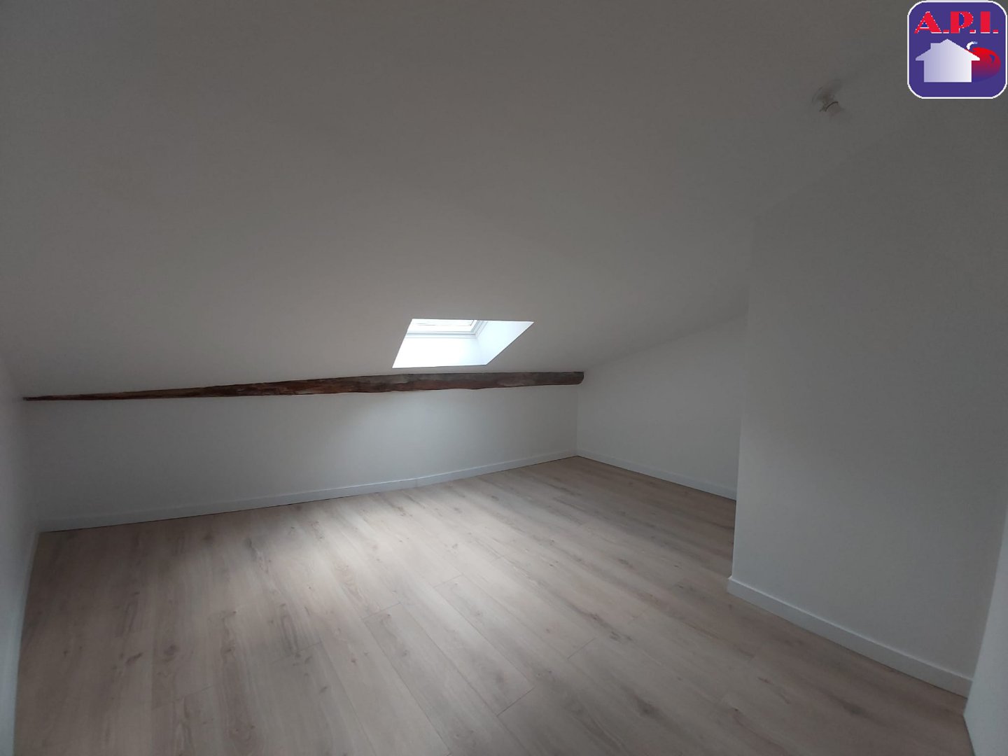 ...Pièce à vivre avec cuisine ouverte aménagée, chambre mansardée de 14 m² au sol, salle d'eau...