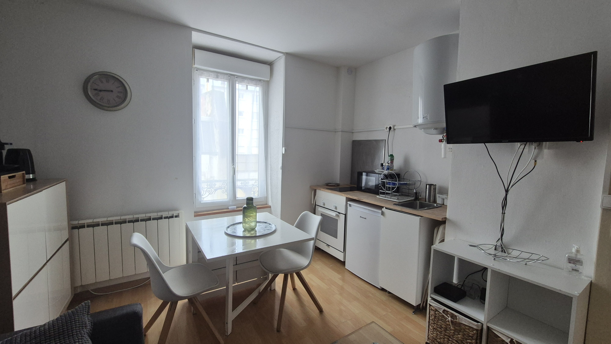 ...Cuisine ouverte sur pièce de vie avec lit gigogne, TV suspendue, salle de douche, WC...
