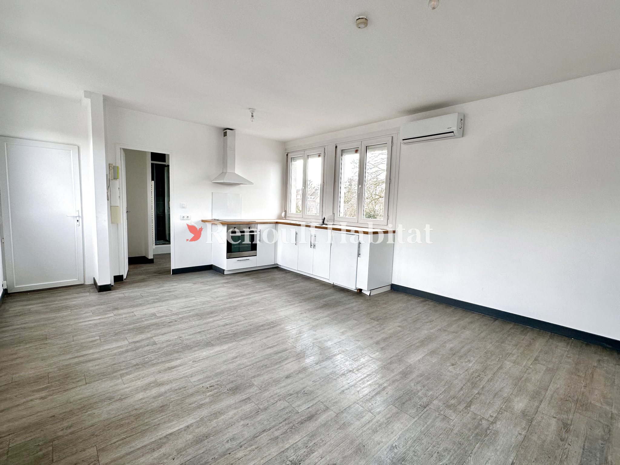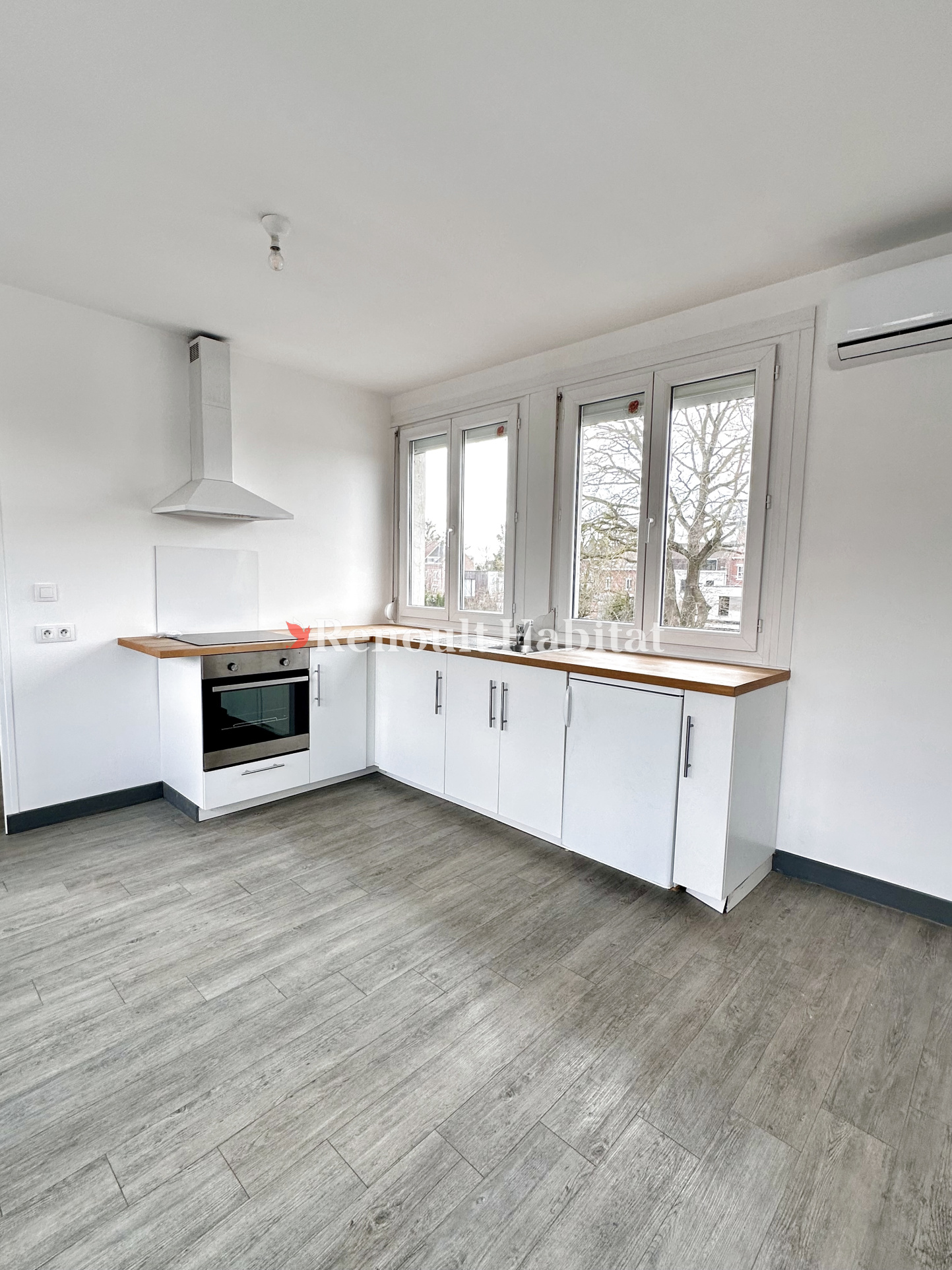 ...Pièce principale avec coin cuisine (meubles + plaque de cuisson + hotte + réfrigérateur), salle...
