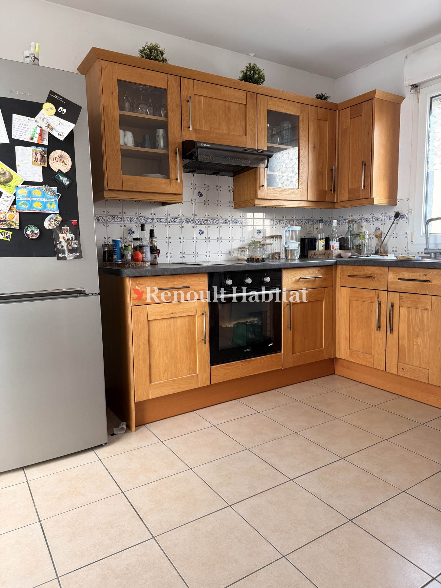 ...Pièce principale avec coin cuisine (meubles + plaque de cuisson + hotte + réfrigérateur), salle...