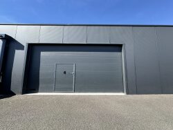 ...Hauteur sous plafond 5 m, 2 portes sectionnelles 4x4m motorisées...