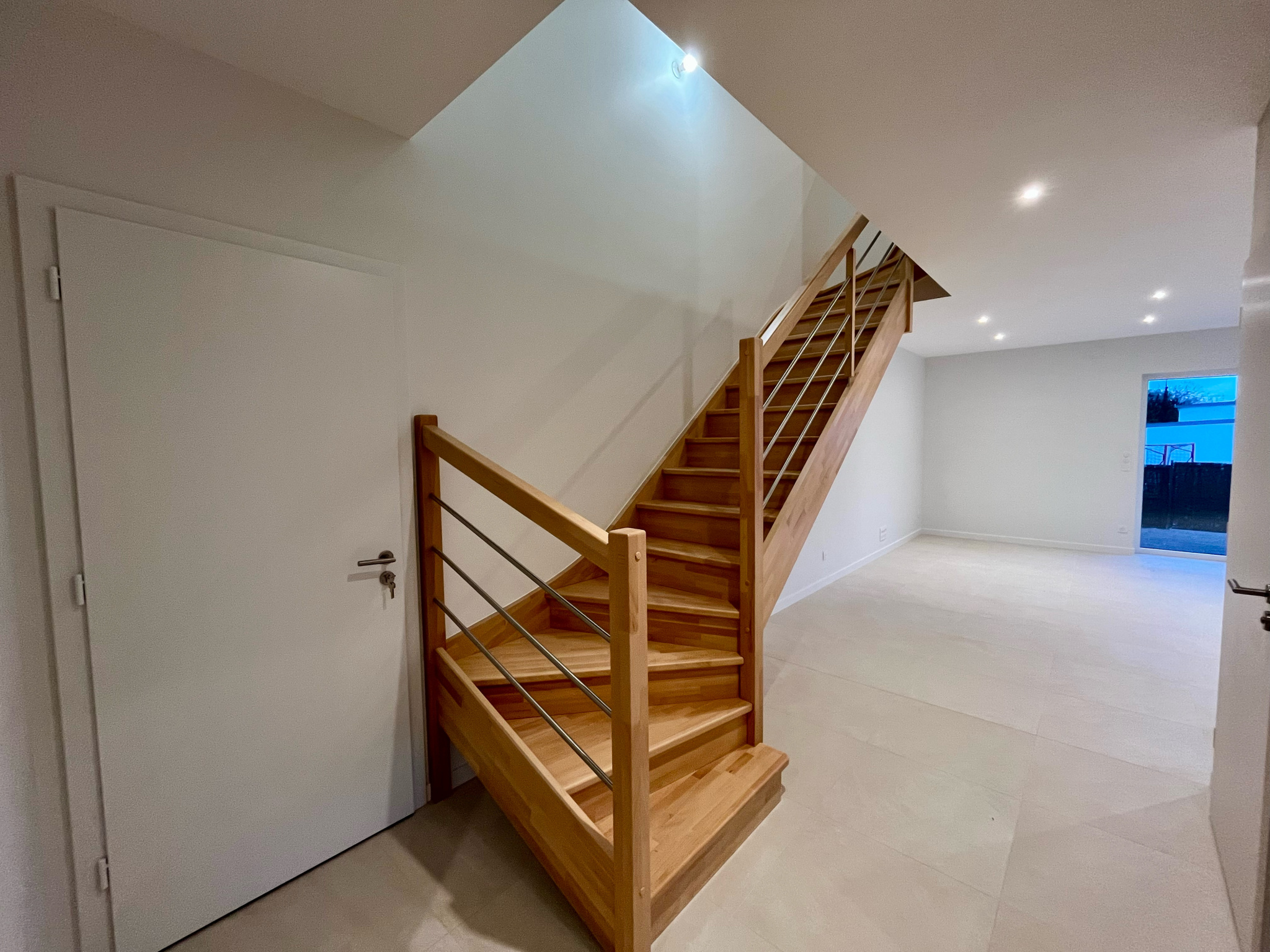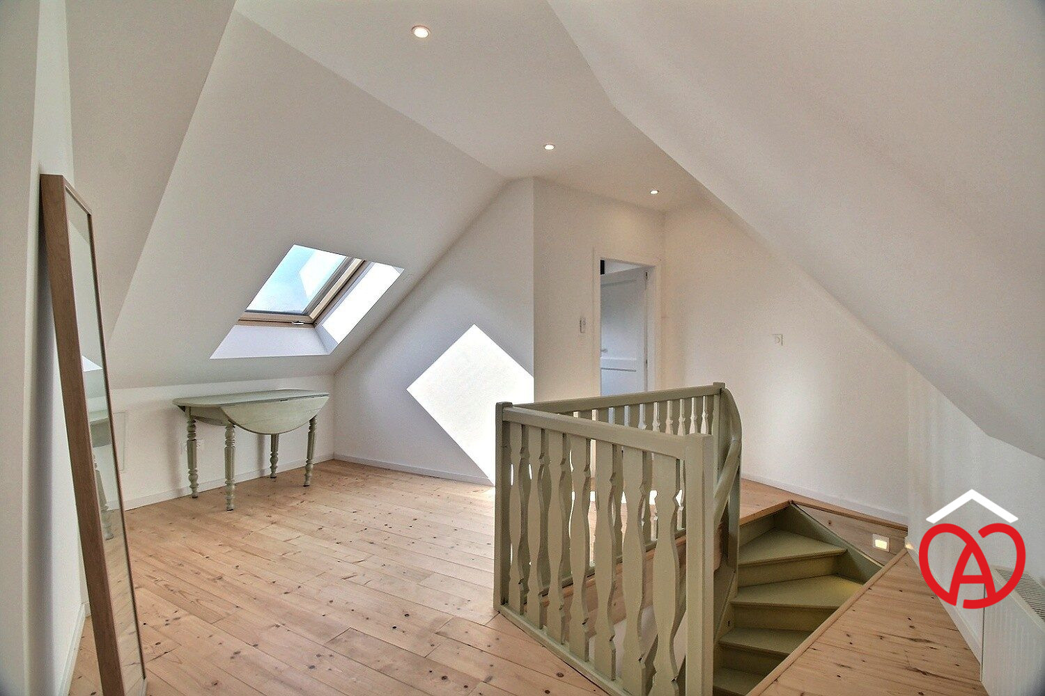 ...Le rez-de-chaussée s'ouvre sur une entrée chaleureuse avec son élégant escalier en bois et un...