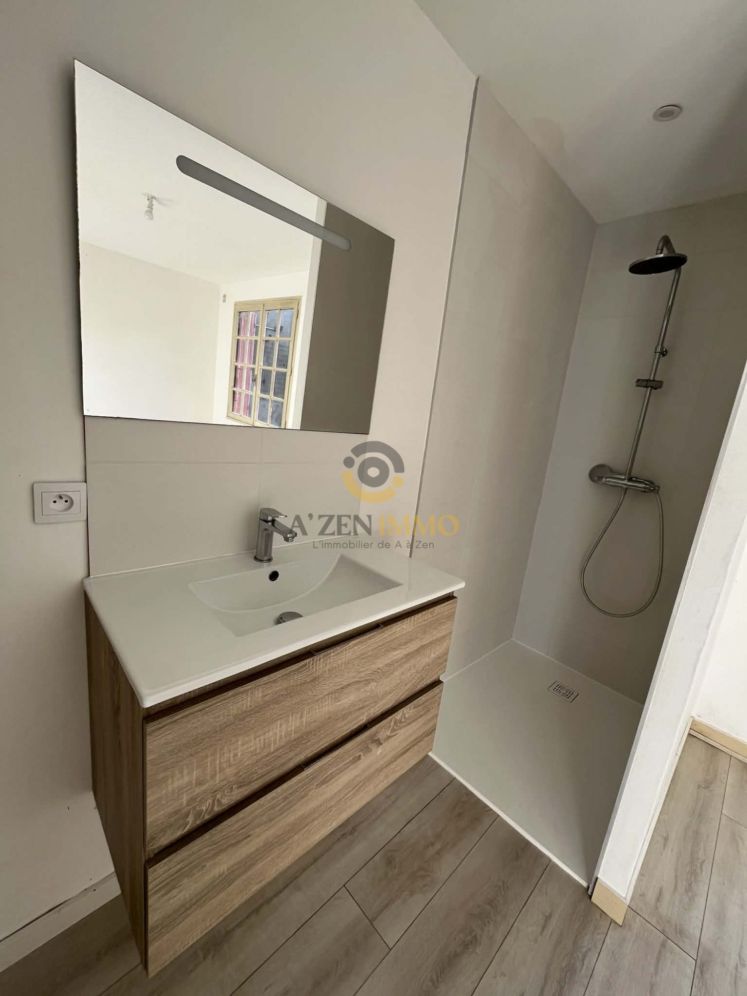 ...A l'étage une chambre avec placard, un bureau avec étagères et une salle d'eau avec douche, une...