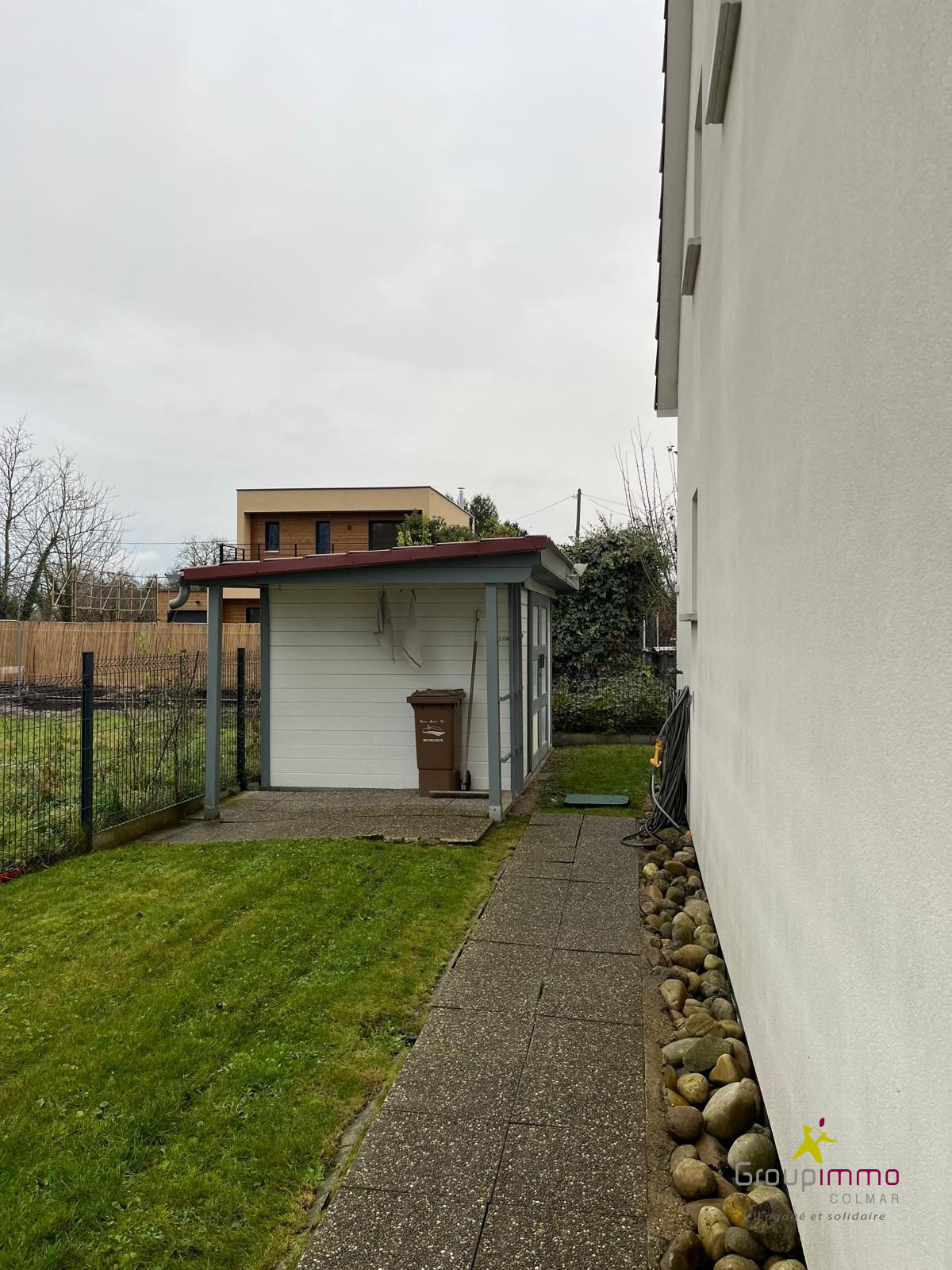 ...A l'extérieur, un jardin arboré avec abri de jardin...