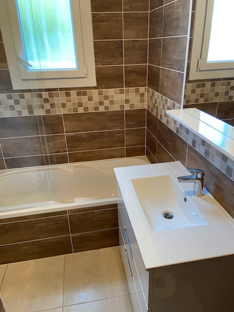... 1 chambre avec placard, une salle de bain avec baignoire et douche, 2 vasques, un WC.