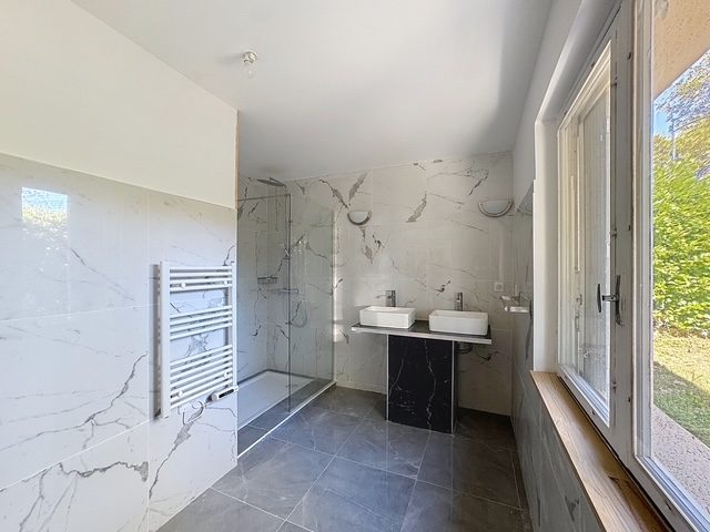 ... sur une jolie parcelle de 1000 m² arborée avec deux terrasses et sans vis-à-vis. Elle comprend en R...