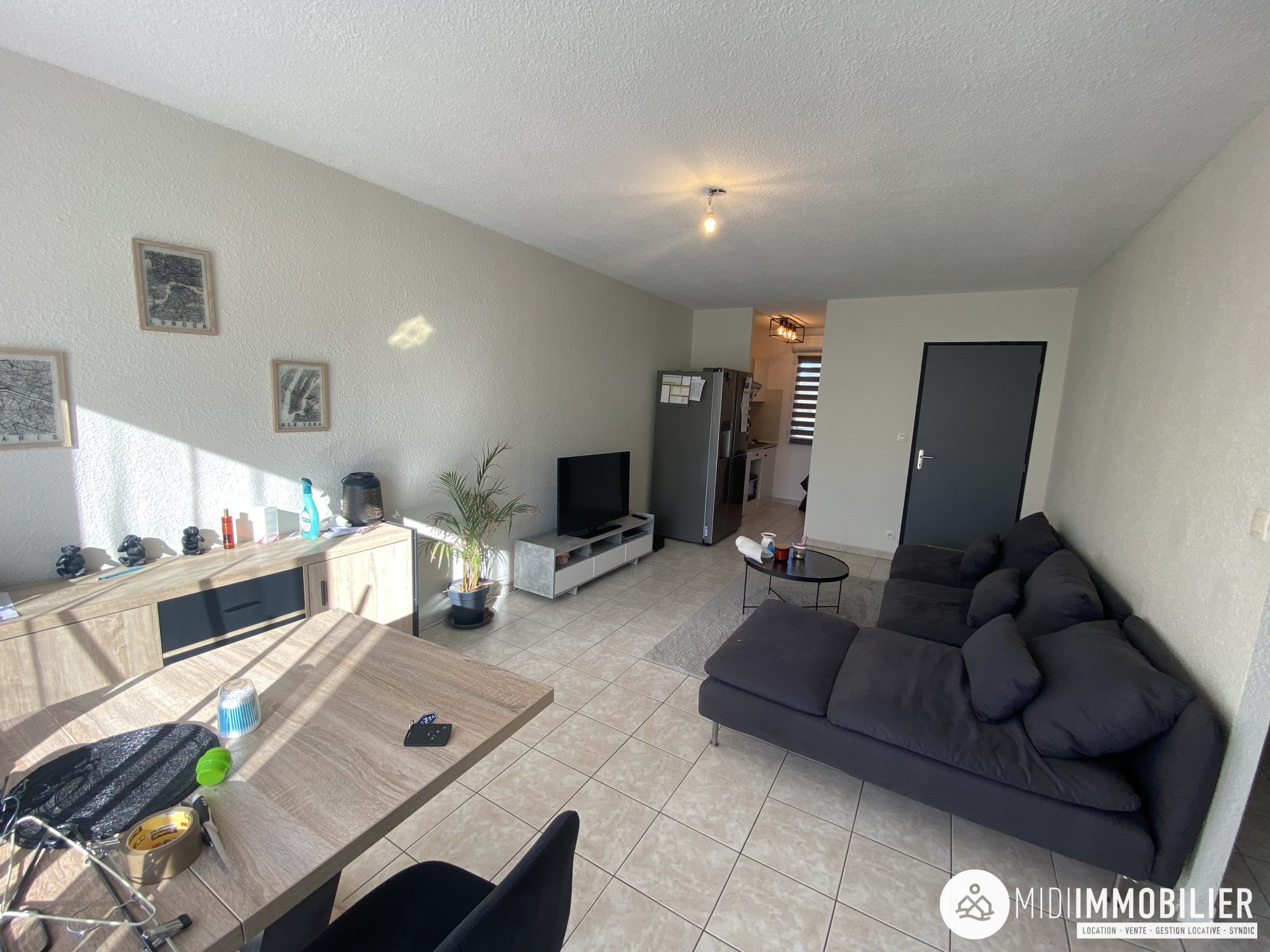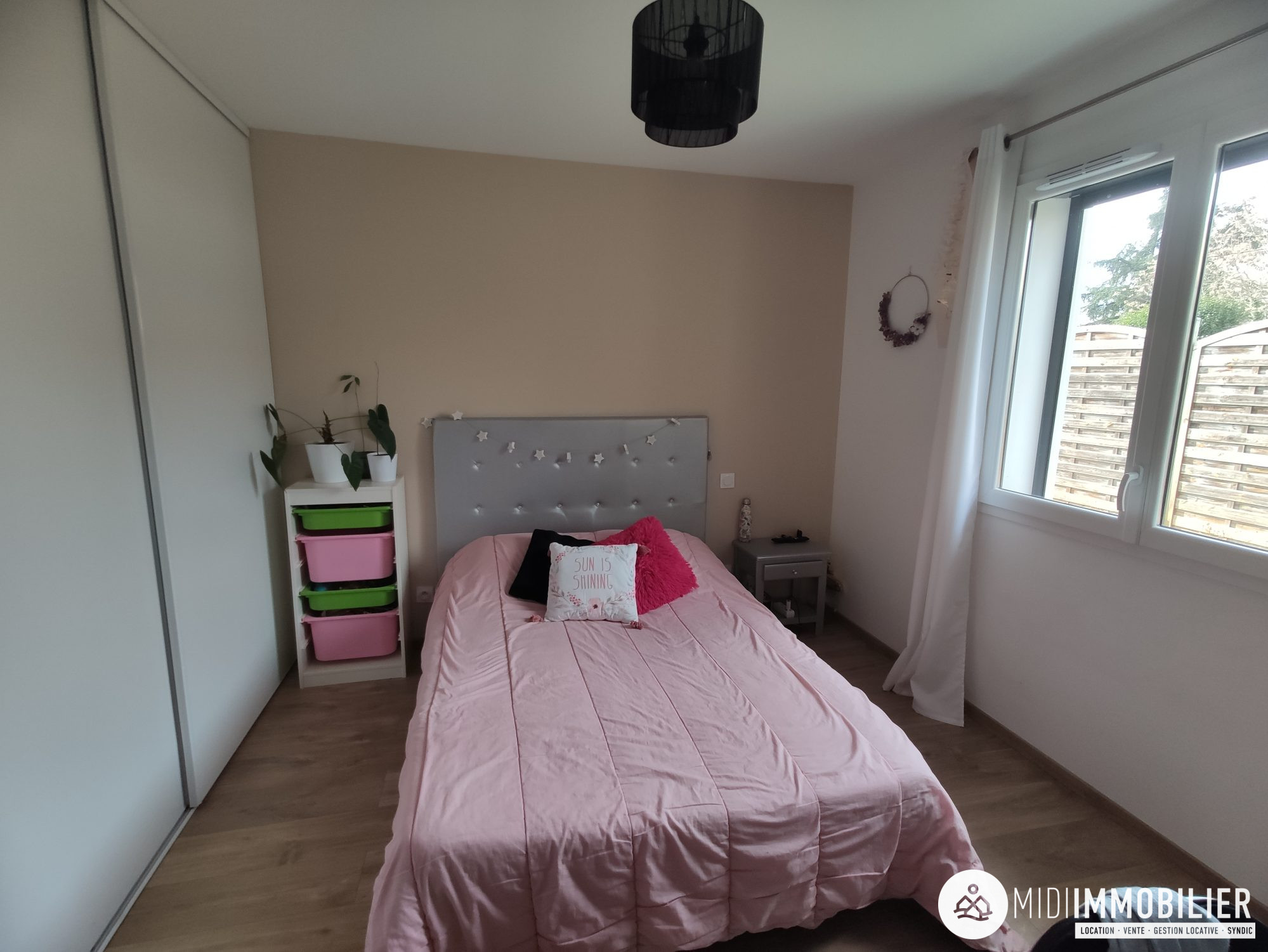 ...Séjour lumineux de 22,80 m² avec placards, desservant la partie nuit et le garage...