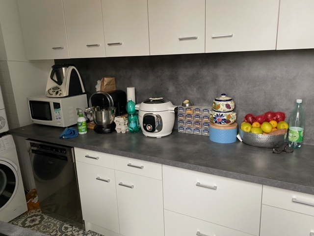 ...À l'étage, cuisine aménagée et équipée (hotte, plaques de cuisson, four, réfrigérateur) ouverte...