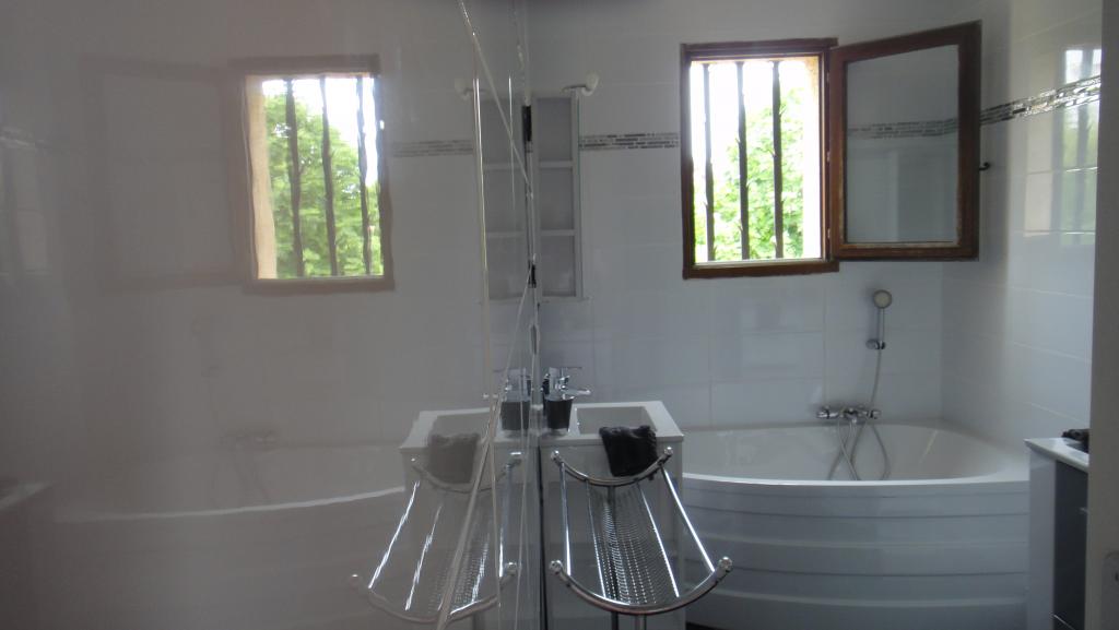 ...1 salle d 'eau et une grande salle de bains avec baignoire , cabine de douches et 2 vasques; lave...