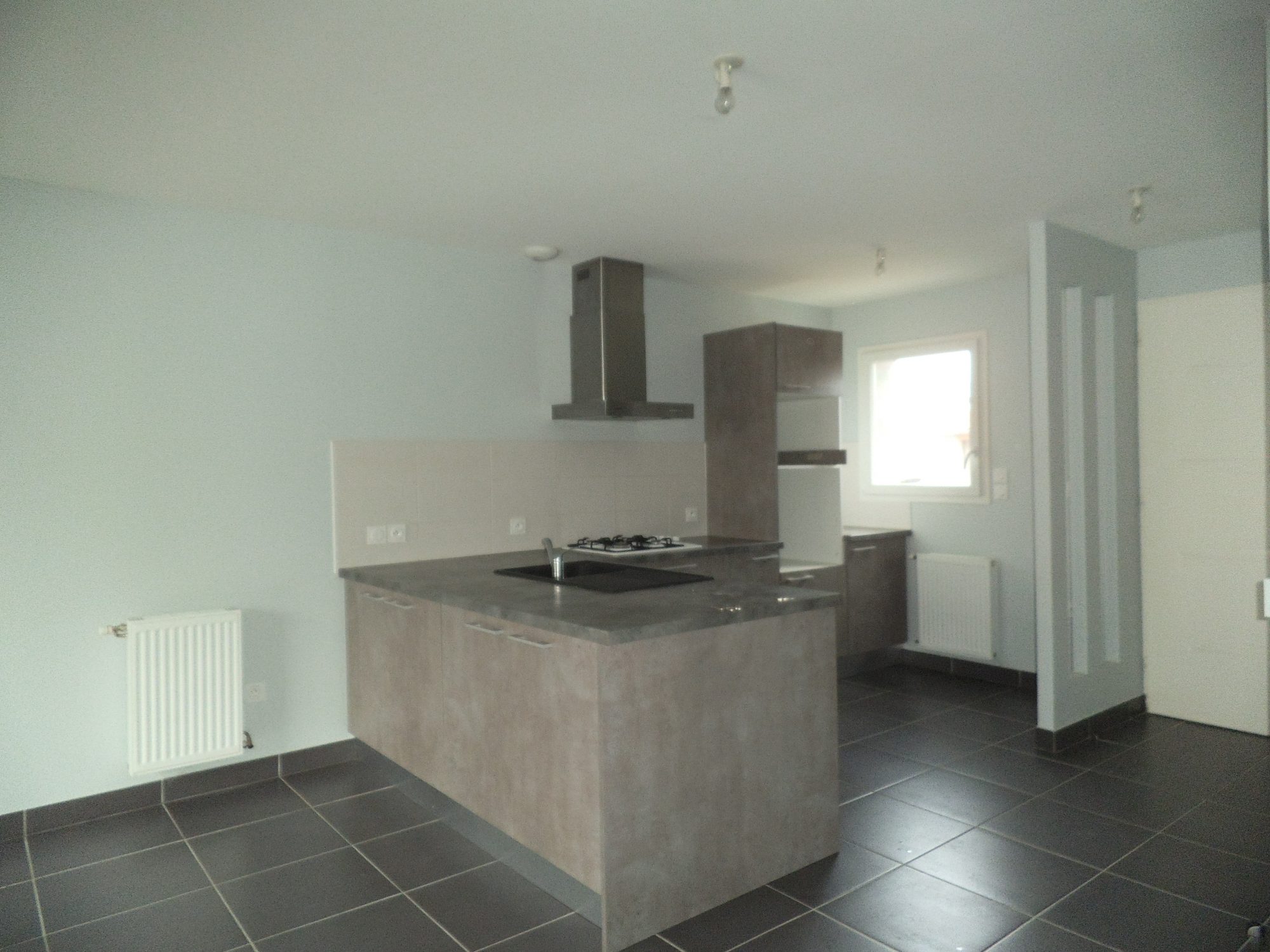 ...Grand séjour avec cuisine américaine équipée et intégrée avec ilot central...