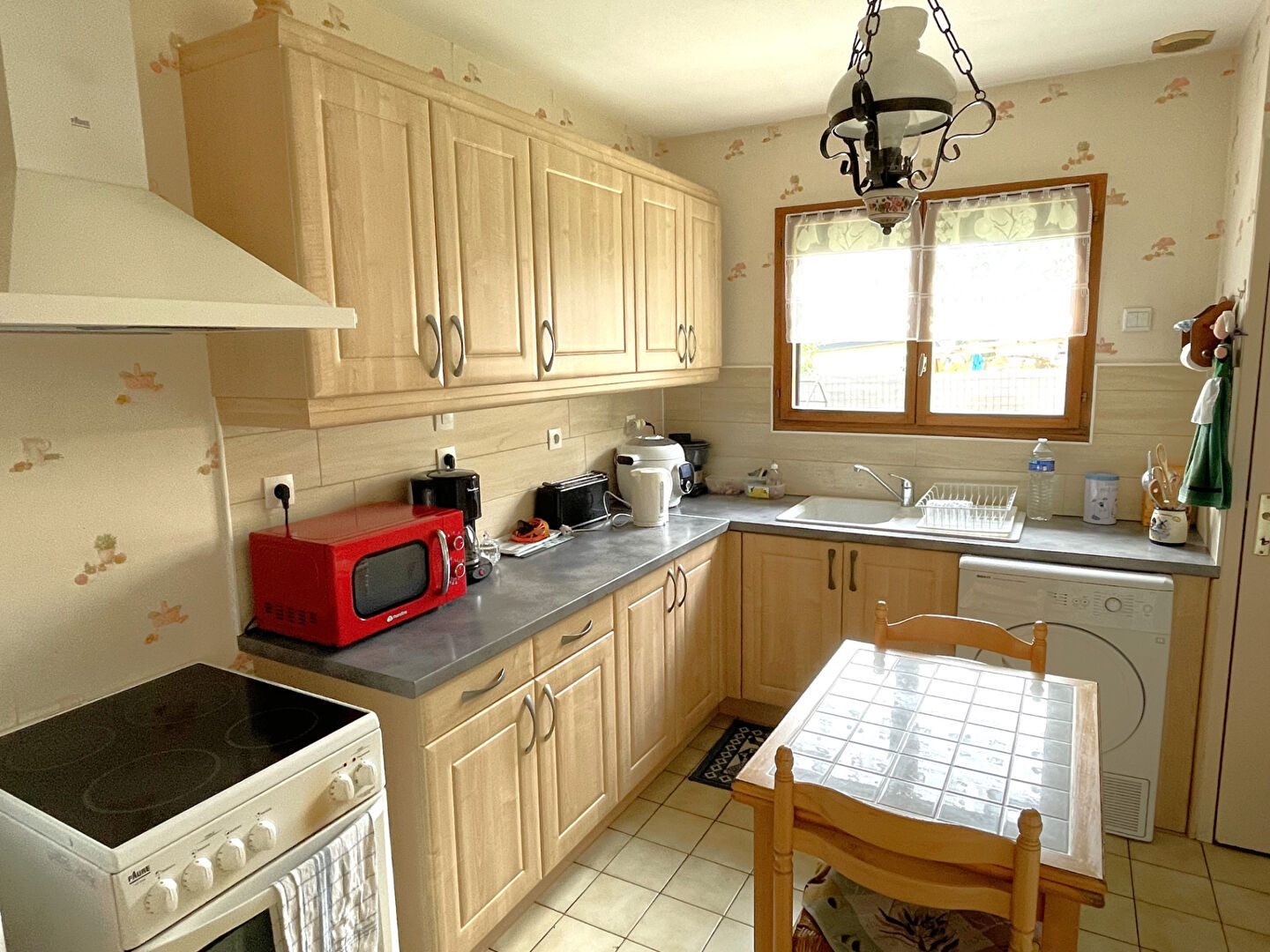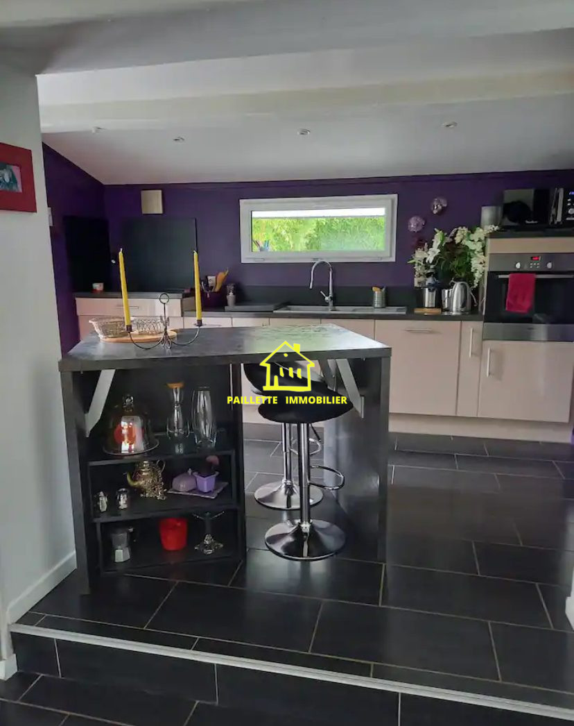 ...RDC : séjour, salon avec poêle à granule , cuisine ouverte équipée ( plaque, frigo , lave...